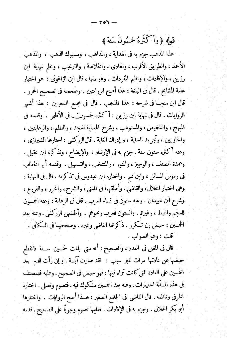 قَوْلُهُ (وَأَكْثَرُهُ خَمْسُونَ سَنَةً) هَذَا الْمَذْهَبُ جَزَمَ بِهِ فِي الْهِدَايَةِ، وَالْمَذَاهِبِ، وَمَسْبُوكِ الذَّهَبِ، وَالْمَذْهَبِ الْأَحْمَدِ، وَالطَّرِيقِ الْأَقْرَبِ، وَالْهَادِي، وَالْخُلَاصَةِ، وَالتَّرْغِيبِ، وَنَظْمِ نِهَايَةِ ابْنِ رَزِينٍ، وَالْإِفَادَاتِ، وَنَظْمِ الْمُفْرَدَاتِ، وَهُوَ مِنْهَا، قَالَ ابْنُ الزَّاغُونِيِّ: هُوَ اخْتِيَارُ عَامَّةِ الْمَشَايِخِ. قَالَ فِي الْبُلْغَةِ: هَذَا أَصَحُّ الرِّوَايَتَيْنِ. وَصَحَّحَهُ فِي تَصْحِيحِ الْمُحَرَّرِ. قَالَ ابْنُ مُنَجَّا فِي شَرْحِهِ: هَذَا الْمَذْهَبُ، قَالَ فِي مَجْمَعِ الْبَحْرَيْنِ: هَذَا أَشْهَرُ الرِّوَايَاتِ، قَالَ فِي نِهَايَةِ ابْنِ رَزِينٍ: أَكْثَرُهُ خَمْسُونَ فِي الْأَظْهَرِ، وَقَدَّمَهُ فِي الْمُبْهِجِ، وَالتَّلْخِيصِ، وَالْمُسْتَوْعِبِ، وَشَرْحِ الْهِدَايَةِ لِلْمَجْدِ، وَالنَّظْمِ، وَالرِّعَايَتَيْنِ، وَالْحَاوِيَيْنِ، وَتَجْرِيدِ الْعِنَايَةِ، وَإِدْرَاكِ الْغَايَةِ. قَالَ الزَّرْكَشِيُّ: اخْتَارَهَا الشِّيرَازِيُّ، وَعَنْهُ أَكْثَرُهُ سِتُّونَ سَنَةً، جَزَمَ بِهِ فِي الْإِرْشَادِ، وَالْإِيضَاحِ، وَتَذْكِرَةِ ابْنِ عَقِيلٍ. وَعُمْدَةِ الْمُصَنِّفِ، وَالْوَجِيزِ، وَالْمُنَوِّرِ، وَالْمُنْتَخَبِ، وَالتَّسْهِيلِ، وَقَدَّمَهُ أَبُو الْخَطَّابِ فِي رُءُوسِ الْمَسَائِلِ، وَابْنُ تَمِيمٍ، وَاخْتَارَهُ ابْنُ عَبْدُوسٍ فِي تَذْكِرَتِهِ. قَالَ فِي النِّهَايَةِ: وَهِيَ اخْتِيَارُ الْخَلَّالِ، وَالْقَاضِي. وَأَطْلَقَهُمَا فِي الْمُغْنِي، وَالشَّرْحِ، وَالْمُحَرَّرِ، وَالْفُرُوعِ، وَشَرْحِ ابْنِ عُبَيْدَانَ. وَعَنْهُ سِتُّونَ فِي نِسَاءِ الْعَرَبِ. قَالَ فِي الرِّعَايَةِ: وَعَنْهُ الْخَمْسُونَ لِلْعَجَمِ وَالنَّبَطِ، وَغَيْرِهِمْ. وَالسِّتُّونَ لِلْعَرَبِ وَنَحْوِهِمْ. وَأَطْلَقَهُنَّ الزَّرْكَشِيُّ. وَعَنْهُ بَعْدَ الْخَمْسِينَ: حَيْضٌ إنْ تَكَرَّرَ. ذَكَرَهُمَا الْقَاضِي وَغَيْرُهُ. وَصَحَّحَهُمَا فِي الْكَافِي. قُلْت: وَهُوَ الصَّوَابُ، قَالَ فِي الْمُغْنِي فِي الْعَدَدِ، وَالصَّحِيحُ: أَنَّهُ مَتَى بَلَغَتْ خَمْسِينَ سَنَةً فَانْقَطَعَ حَيْضُهَا عَنْ عَادَتِهَا مَرَّاتٍ لِغَيْرِ سَبَبٍ: فَقَدْ صَارَتْ آيِسَةً، وَإِنْ رَأَتْ الدَّمَ بَعْدَ الْخَمْسِينَ عَلَى الْعَادَةِ الَّتِي كَانَتْ تَرَاهُ فِيهَا، فَهُوَ حَيْضٌ فِي الصَّحِيحِ. وَعَلَيْهِ فَلِلْمُصَنِّفِ فِي هَذِهِ الْمَسْأَلَةِ اخْتِيَارَاتٌ. وَعَنْهُ بَعْدَ الْخَمْسِينَ مَشْكُوكٌ فِيهِ. فَتَصُومُ وَتُصَلِّي، اخْتَارَهُ الْخِرَقِيُّ وَنَاظِمُهُ. قَالَ الْقَاضِي فِي الْجَامِعِ الصَّغِيرِ: هَذَا أَصَحُّ الرِّوَايَاتِ، وَاخْتَارَهَا أَبُو بَكْرٍ الْخَلَّالُ، وَجَزَمَ بِهِ فِي الْإِفَادَاتِ. فَعَلَيْهَا تَصُومُ وُجُوبًا عَلَى الصَّحِيحِ، قَدَّمَهُ