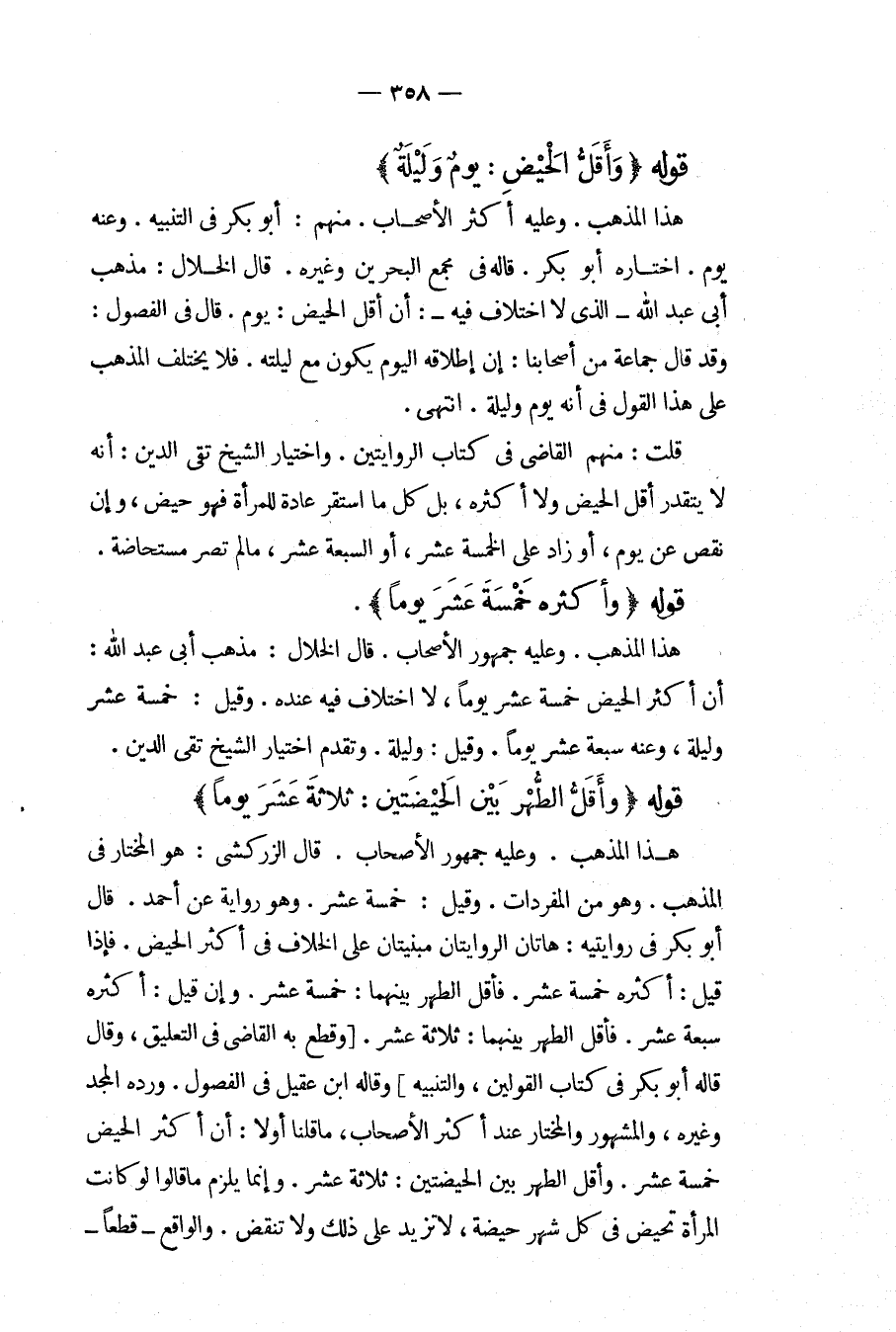 قُلْت: مِنْهُمْ الْقَاضِي فِي كِتَابِ الرِّوَايَتَيْنِ، وَاخْتِيَارُ الشَّيْخِ تَقِيِّ الدِّينِ: أَنَّهُ لَا يَتَقَدَّرُ أَقَلُّ الْحَيْضِ وَلَا أَكْثَرُهُ، بَلْ كُلُّ مَا اسْتَقَرَّ عَادَةً لِلْمَرْأَةِ فَهُوَ حَيْضٌ، وَإِنْ نَقَصَ عَنْ يَوْمٍ، أَوْ زَادَ عَلَى الْخَمْسَةَ عَشَرَ، أَوْ السَّبْعَةَ عَشَرَ، مَا لَمْ تَصِرْ مُسْتَحَاضَةً.