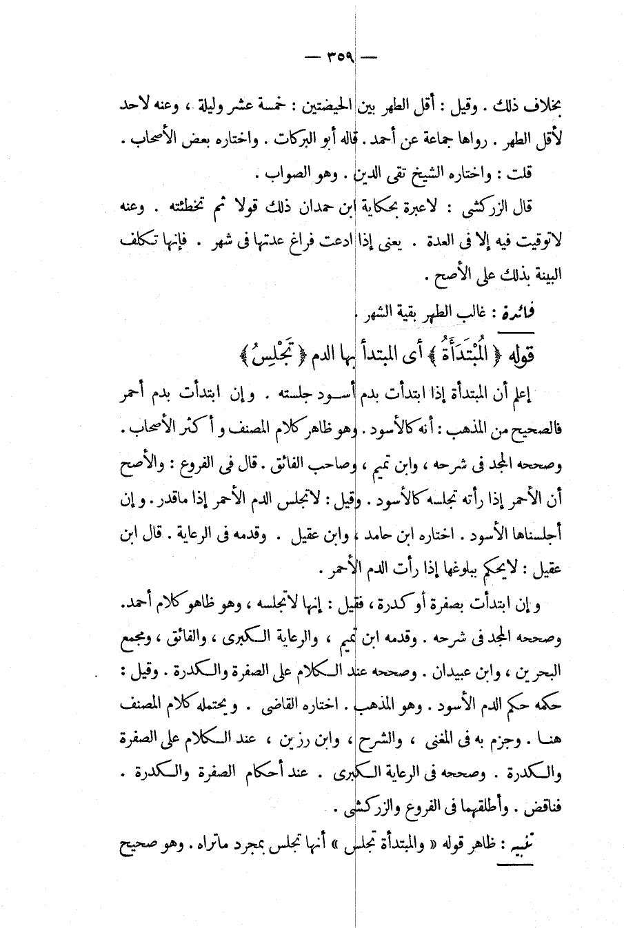 قَوْلُهُ (الْمُبْتَدَأَةُ) أَيْ الْمُبْتَدَأُ بِهَا الدَّمُ (تَجْلِسُ) اعْلَمْ أَنَّ الْمُبْتَدَأَةَ إذَا ابْتَدَأَتْ بِدَمٍ أَسْوَدَ جَلَسَتْهُ وَإِنْ ابْتَدَأَتْ بِدَمٍ أَحْمَرَ فَالصَّحِيحُ مِنْ الْمَذْهَبِ: أَنَّهُ كَالْأَسْوَدِ، وَهُوَ ظَاهِرُ كَلَامِ الْمُصَنِّفِ وَأَكْثَرِ الْأَصْحَابِ، وَصَحَّحَهُ الْمَجْدُ فِي شَرْحِهِ، وَابْنُ تَمِيمٍ، وَصَاحِبُ الْفَائِقِ. قَالَ فِي الْفُرُوعِ: وَالْأَصَحُّ أَنَّ الْأَحْمَرَ إذَا رَأَتْهُ تَجْلِسُهُ كَالْأَسْوَدِ. وَقِيلَ: لَا تَجْلِسُ الدَّمَ الْأَحْمَرَ إذَا مَا قُدِّرَ، وَإِنْ أَجْلَسْنَاهَا الْأَسْوَدَ، اخْتَارَهُ ابْنُ حَامِدٍ، وَابْنُ عَقِيلٍ. وَقَدَّمَهُ فِي الرِّعَايَةِ. قَالَ ابْنُ عَقِيلٍ: لَا يُحْكَمُ بِبُلُوغِهَا إذَا رَأَتْ الدَّمَ الْأَحْمَرَ، وَإِنْ ابْتَدَأَتْ بِصُفْرَةٍ أَوْ كُدْرَةٍ، فَقِيلَ: إنَّهَا لَا تَجْلِسُهُ، وَهُوَ ظَاهِرُ كَلَامِ أَحْمَدَ، وَصَحَّحَهُ الْمَجْدُ فِي شَرْحِهِ. وَقَدَّمَهُ ابْنُ تَمِيمٍ، وَالرِّعَايَةُ الْكُبْرَى، وَالْفَائِقُ، وَمَجْمَعُ الْبَحْرَيْنِ، وَابْنُ عُبَيْدَانَ، وَصَحَّحَهُ عِنْدَ الْكَلَامِ عَلَى الصُّفْرَةِ وَالْكُدْرَةِ. وَقِيلَ: حُكْمُهُ حُكْمُ الدَّمِ الْأَسْوَدِ، وَهُوَ الْمَذْهَبُ، اخْتَارَهُ الْقَاضِي. وَيَحْتَمِلُهُ كَلَامُ الْمُصَنِّفِ هُنَا وَجَزَمَ بِهِ فِي الْمُغْنِي، وَالشَّرْحِ، وَابْنِ رَزِينٍ، عِنْدَ الْكَلَامِ عَلَى الصُّفْرَةِ وَالْكُدْرَةِ وَصَحَّحَهُ فِي الرِّعَايَةِ الْكُبْرَى. عِنْدَ أَحْكَامِ الصُّفْرَةِ وَالْكُدْرَةِ. فَنَاقَضَ. وَأَطْلَقَهُمَا فِي الْفُرُوعِ وَالزَّرْكَشِيُّ.