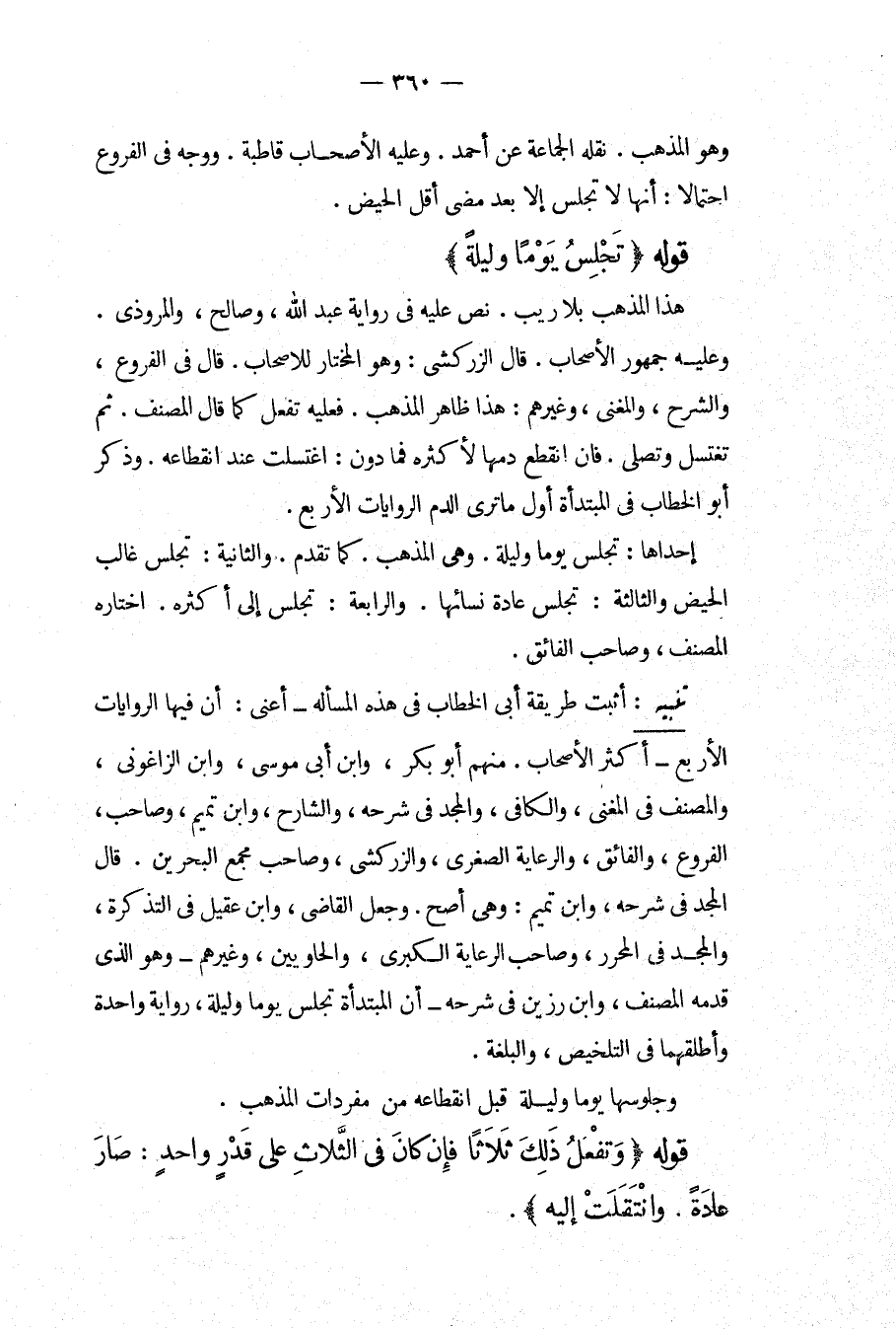 وَهُوَ الْمَذْهَبُ، نَقَلَهُ الْجَمَاعَةُ عَنْ أَحْمَدَ. وَعَلَيْهِ الْأَصْحَابُ قَاطِبَةً. وَوَجَّهَ فِي الْفُرُوعِ احْتِمَالًا: أَنَّهَا لَا تَجْلِسُ إلَّا بَعْدَ مُضِيِّ أَقَلِّ الْحَيْضِ. قَوْلُهُ (تَجْلِسُ يَوْمًا وَلَيْلَةً) هَذَا الْمَذْهَبُ بِلَا رَيْبٍ. نُصَّ عَلَيْهِ فِي رِوَايَةِ عَبْدِ اللَّهِ، وَصَالِحٍ، وَالْمَرُّوذِيِّ. وَعَلَيْهِ جُمْهُورُ الْأَصْحَابِ. قَالَ الزَّرْكَشِيُّ: وَهُوَ الْمُخْتَارُ لِلْأَصْحَابِ. قَالَ فِي الْفُرُوعِ، وَالشَّرْحِ، وَالْمُغْنِي، وَغَيْرِهِمْ: هَذَا ظَاهِرُ الْمَذْهَبِ. فَعَلَيْهِ تَفْعَلُ كَمَا قَالَ الْمُصَنِّفُ. ثُمَّ تَغْتَسِلُ وَتُصَلِّي. فَإِنْ انْقَطَعَ دَمُهَا لِأَكْثَرِهِ فَمَا دُونَ: اغْتَسَلَتْ عِنْدَ انْقِطَاعِهِ. وَذَكَرَ أَبُو الْخَطَّابِ فِي الْمُبْتَدَأَةِ أَوَّلَ مَا تَرَى الدَّمَ الرِّوَايَاتِ الْأَرْبَعَ.