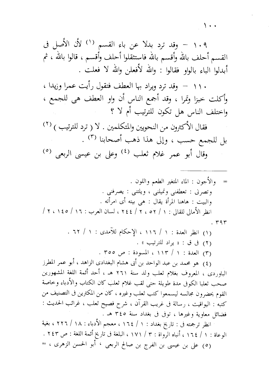 ١١٠ - وقد ترد ويراد بها العطف فتقول رأيت عمراً وزيداً، وأكلت خبزاً وتمراً، وقد أجمع الناس أن واو العطف هي للجمع، واختلف الناس هل تكون للترتيب أم لا؟