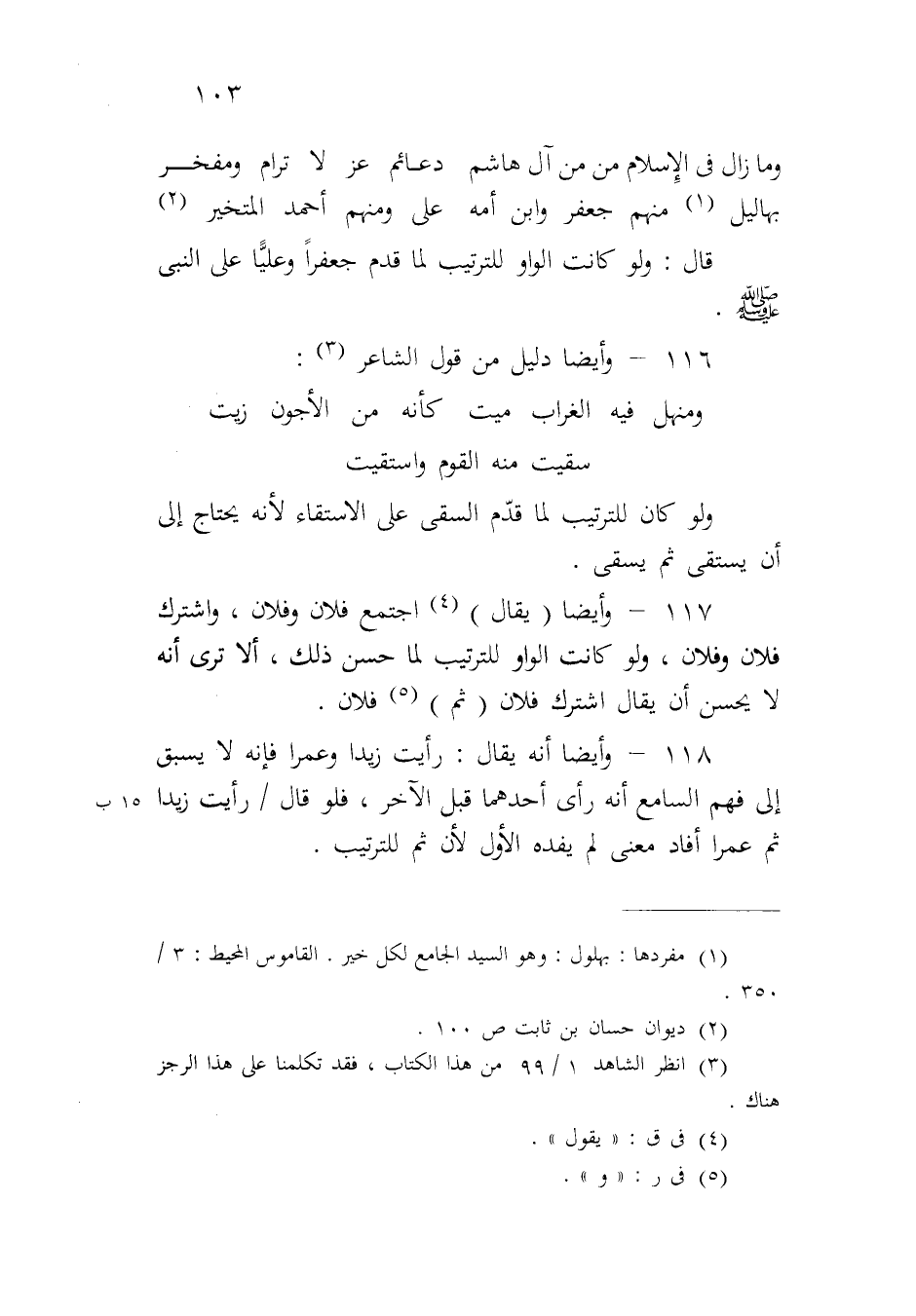 ١١٧ - وأيضاً (يقال) اجتمع فلان وفلان، واشترك فلان وفلان، ولو كانت الواو للترتيب لما حسن ذلك، ألا ترى أنه لا يحسن أن يقال اشترك فلان (ثم) فلان.