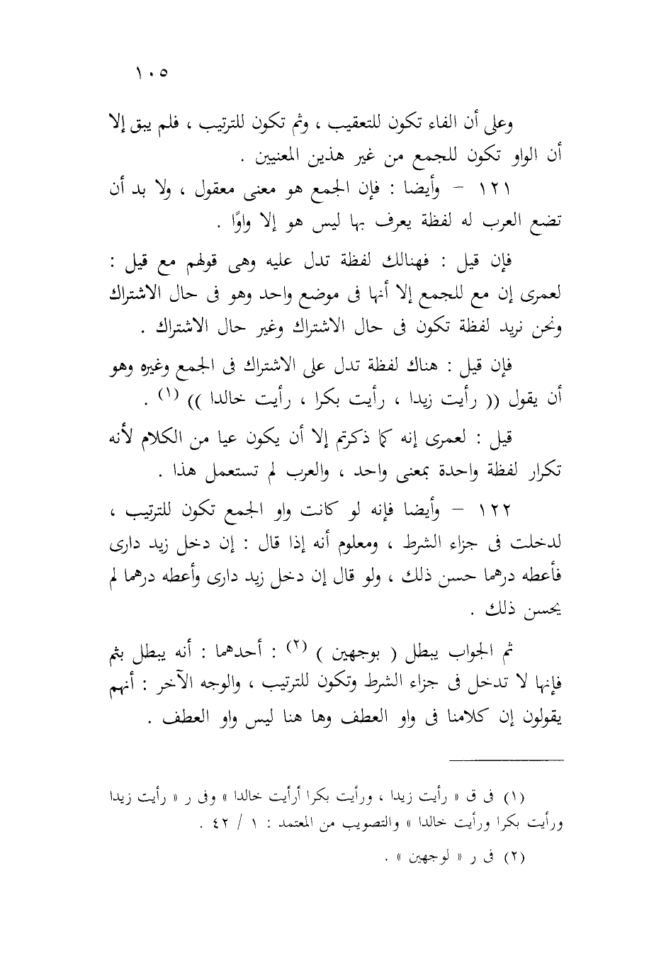 ١٢٢ - وأيضاً فإنه لو كانت واو الجمع تكون للترتيب، لدخلت في جزاء الشرط، ومعلوم أنه إذا قال: إن دخل زيد داري فأعطه درهماً حسن ذلك، ولو قال إن دخل زيد داري وأعطه درهماً لم يحسن ذلك.