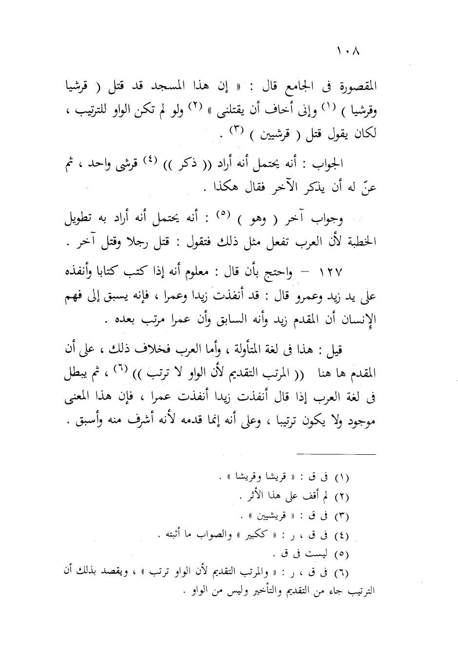 المقصورة في الجامع قال: "إن هذا المسجد قد قتل (قرشياً وقرشياً) وإني أخاف أن يقتلني" ولو لم تكن الواو للترتيب، لكان يقول قتل (قرشيين).