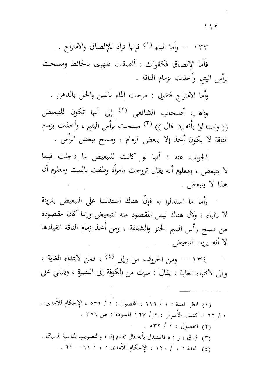 ١٣٣ - وأما الباء فإنها تراد للإلصاق والامتزاج.