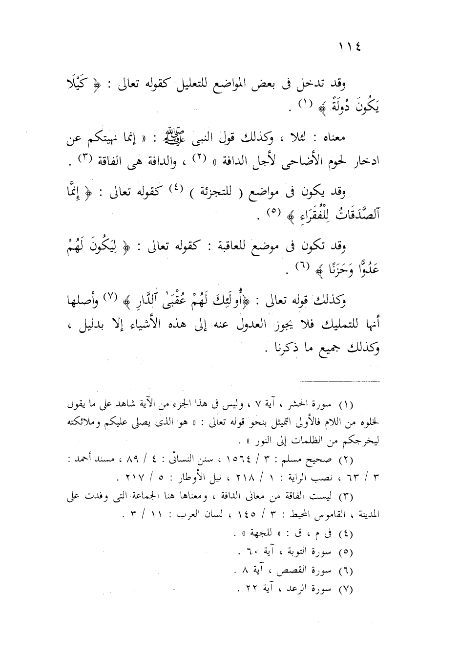 معناه: لئلا، وكذلك قول النبي صلى الله عليه وسلم: "إنما نهيتكم عن ادخار لحوم الأضاحي لأجل الدافة"، والدافة هي الفاقة.
