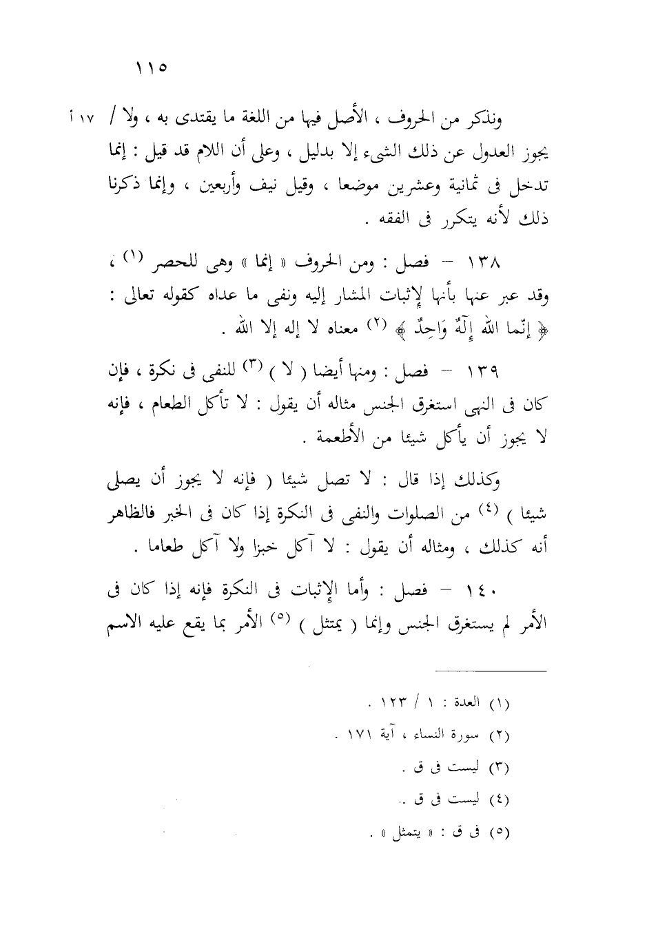 ١٣٨ - فصل: ومن الحروف "إنما" وهي للحصر، وقد عبر عنها بأنها لإثبات المشار إليه ونفي ما عداه كقوله تعالى: {إِنَّمَا اللَّهُ إِلَهٌ وَاحِدٌ} معناه لا إله إلا الله.