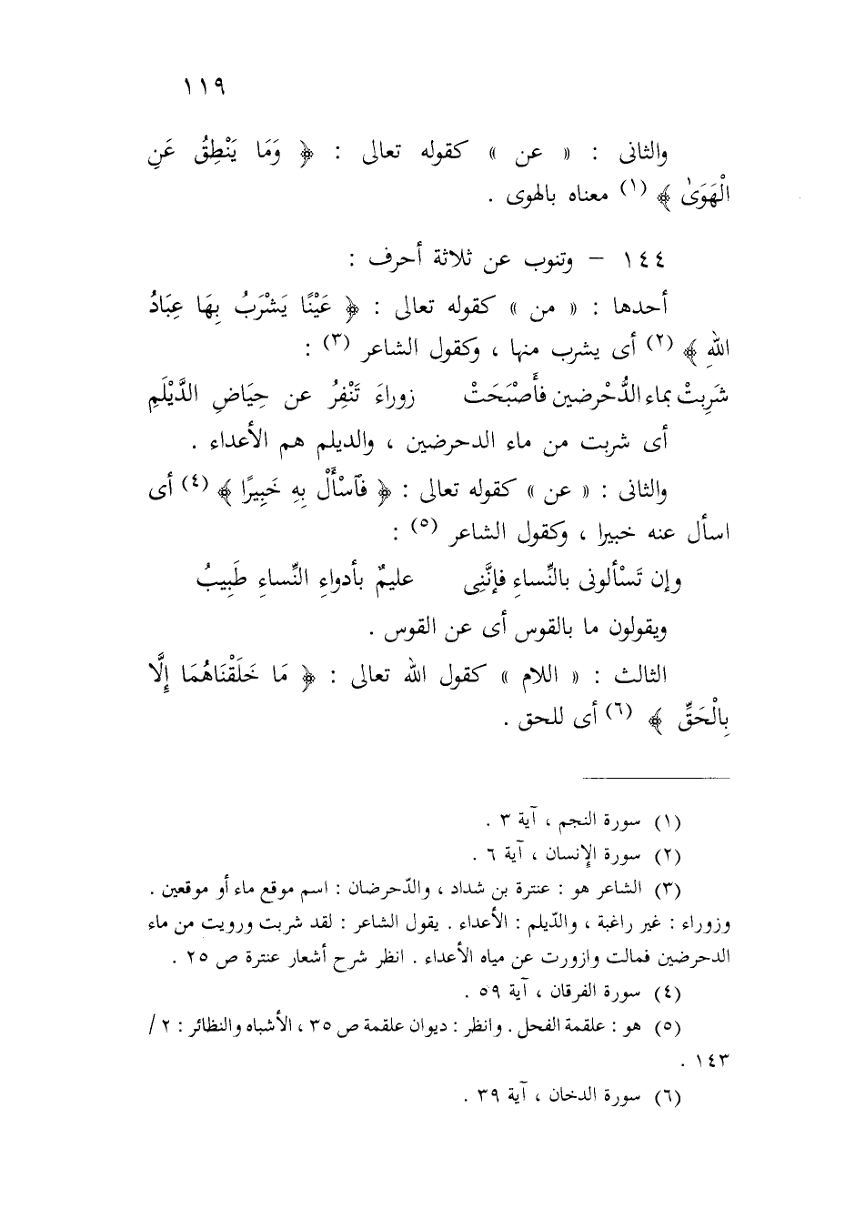والثاني: "عن" كقوله تعالى: {وَمَا يَنْطِقُ عَنِ الْهَوَى} معناه بالهوى.