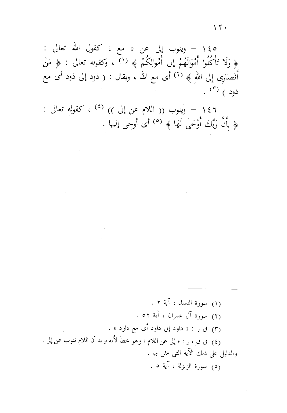 ١٤٥ - وينوب إلى عن "مع" كقول الله تعالى: {وَلَا تَاكُلُوا أَمْوَالَهُمْ إِلَى أَمْوَالِكُمْ}، وكقوله تعالى: {مَنْ أَنْصَارِي إِلَى اللَّهِ} أي مع الله، ويقال: (ذود إلى ذود أي مع ذود).