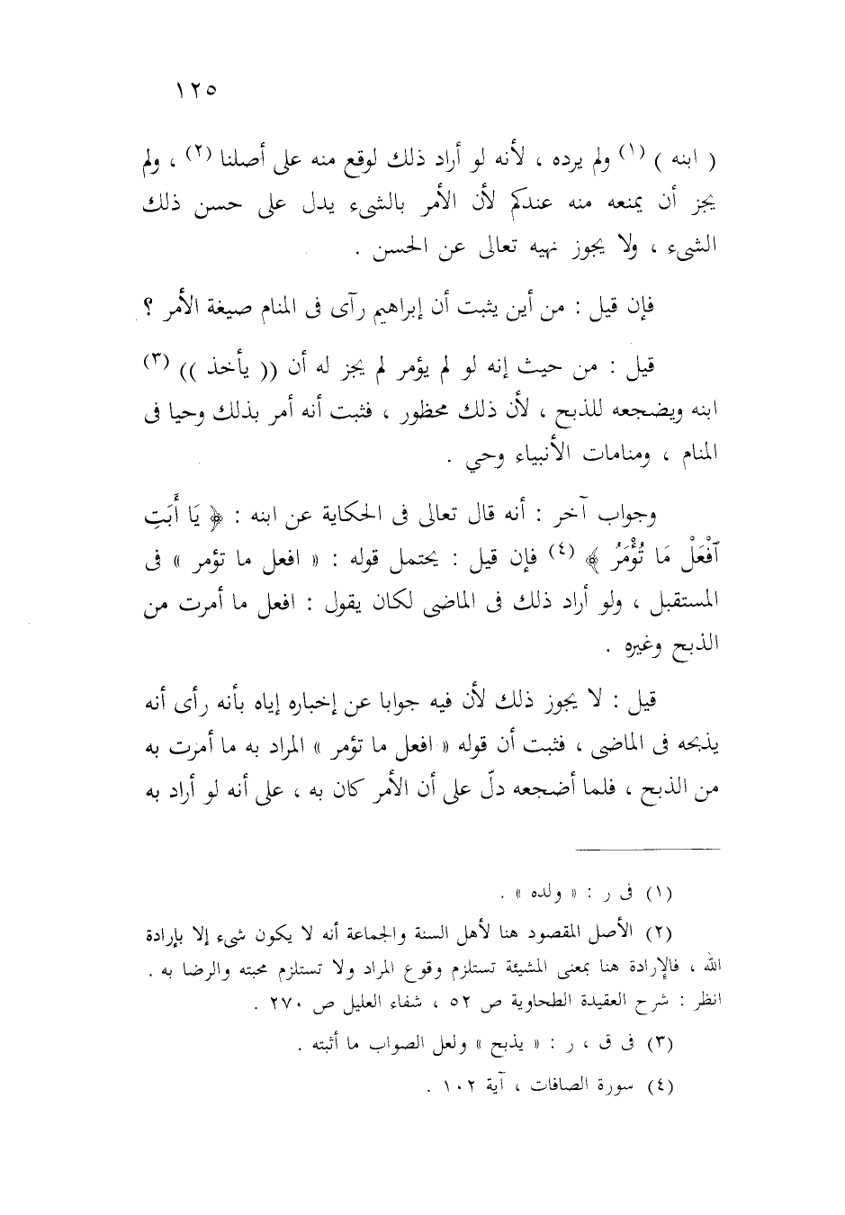 (ابنه) ولم يرده، لأنه لو أراد ذلك لوقع منه على أصلنا، ولم يجز أن يمنعه منه عندكم لأن الأمر بالشيء يدل على حسن ذلك الشيء، ولا يجوز نهيه تعالى عن الحسن.