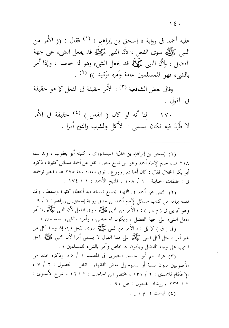 عليه أحمد في رواية "إسحق بن إبراهيم" فقال: ((الأمر من النبي صلى الله عليه وسلم سوى الفعل، لأن النبي صلى الله عليه وسلم قد يفعل الشيء على جهة الفضل، ولأن النبي صلى الله عليه وسلم قد يفعل الشيء وهو له خاصة، وإذا أمر بالشيء فهو للمسلمين عامة وأمره توكيد)).