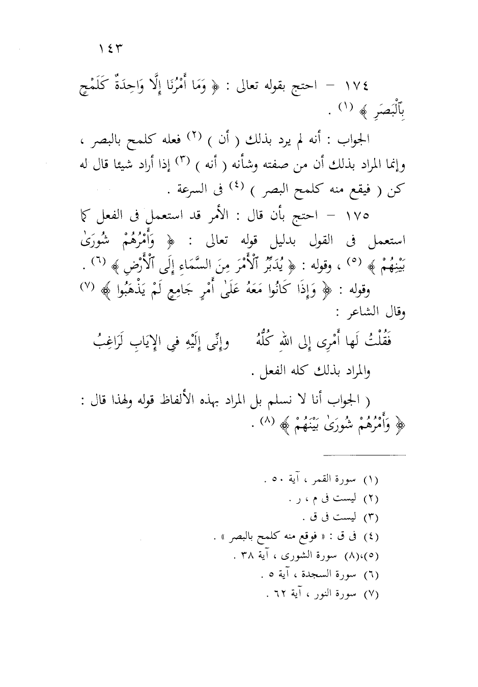 ١٧٥ - احتج بأن قال: الأمر قد استعمل في الفعل كما استعمل في القول بدليل قوله تعالى: {وَأَمْرُهُمْ شُورَى بَيْنَهُمْ}، وقوله: {يُدَبِّرُ الْأَمْرَ مِنَ السَّمَاءِ إِلَى الْأَرْضِ}.