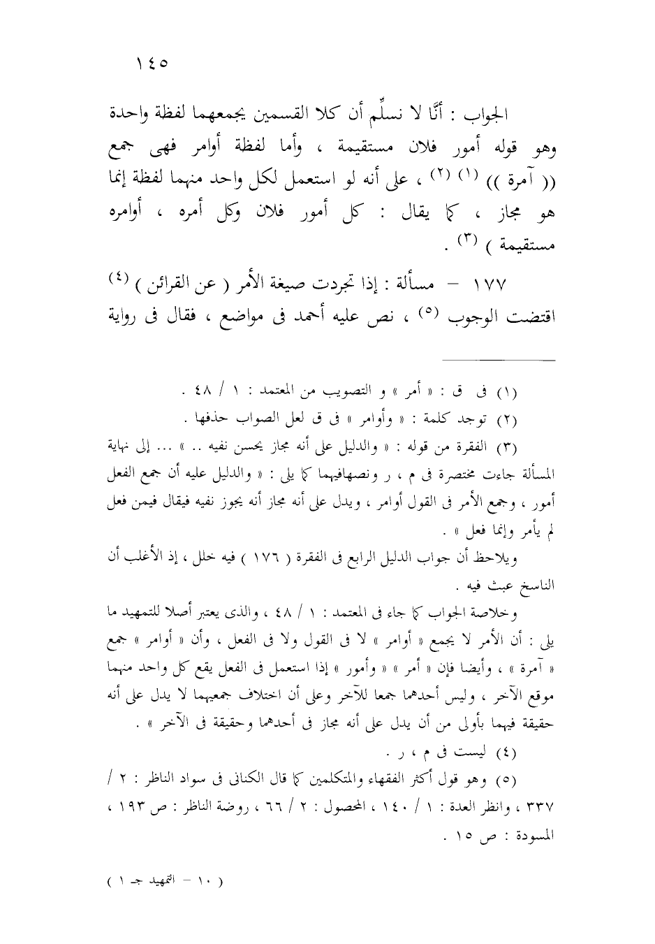 ١٧٧ - مسألة: إذا تجردت صيغة الأمر (عن القرائن) اقتضت الوجوب، نص عليه أحمد في مواضع، فقال في رواية