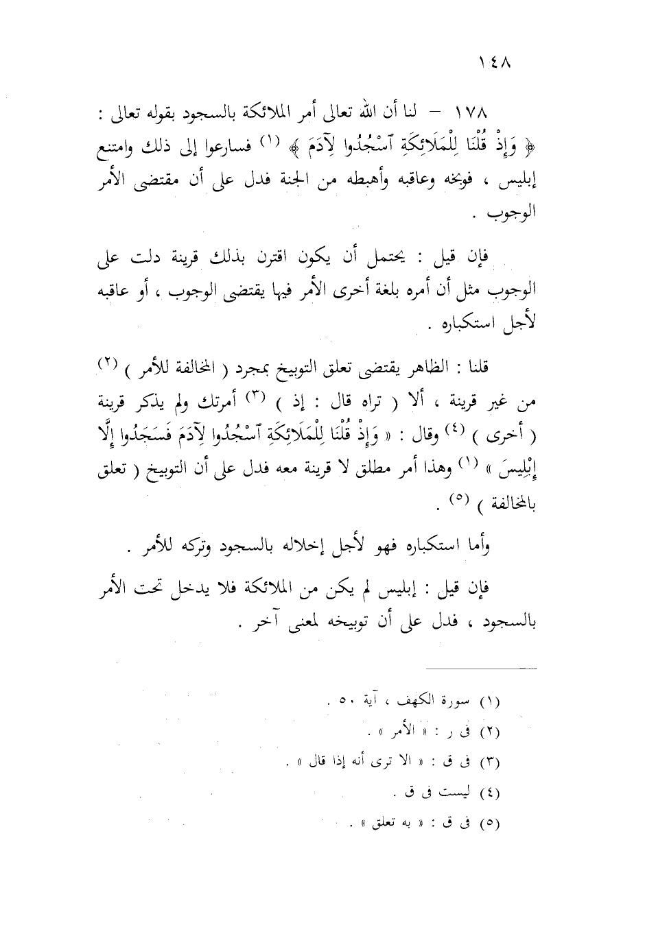 ١٧٨ - لنا أن الله تعالى أمر الملائكة بالسجود بقوله تعالى: {وَإِذْ قُلْنَا لِلْمَلَائِكَةِ اسْجُدُوا لِآَدَمَ} فسارعوا إلى ذلك وامتنع إبليس، فوبخه وعاقبه وأهبطه من الجنة فدل على أن مقتضى الأمر الوجوب.