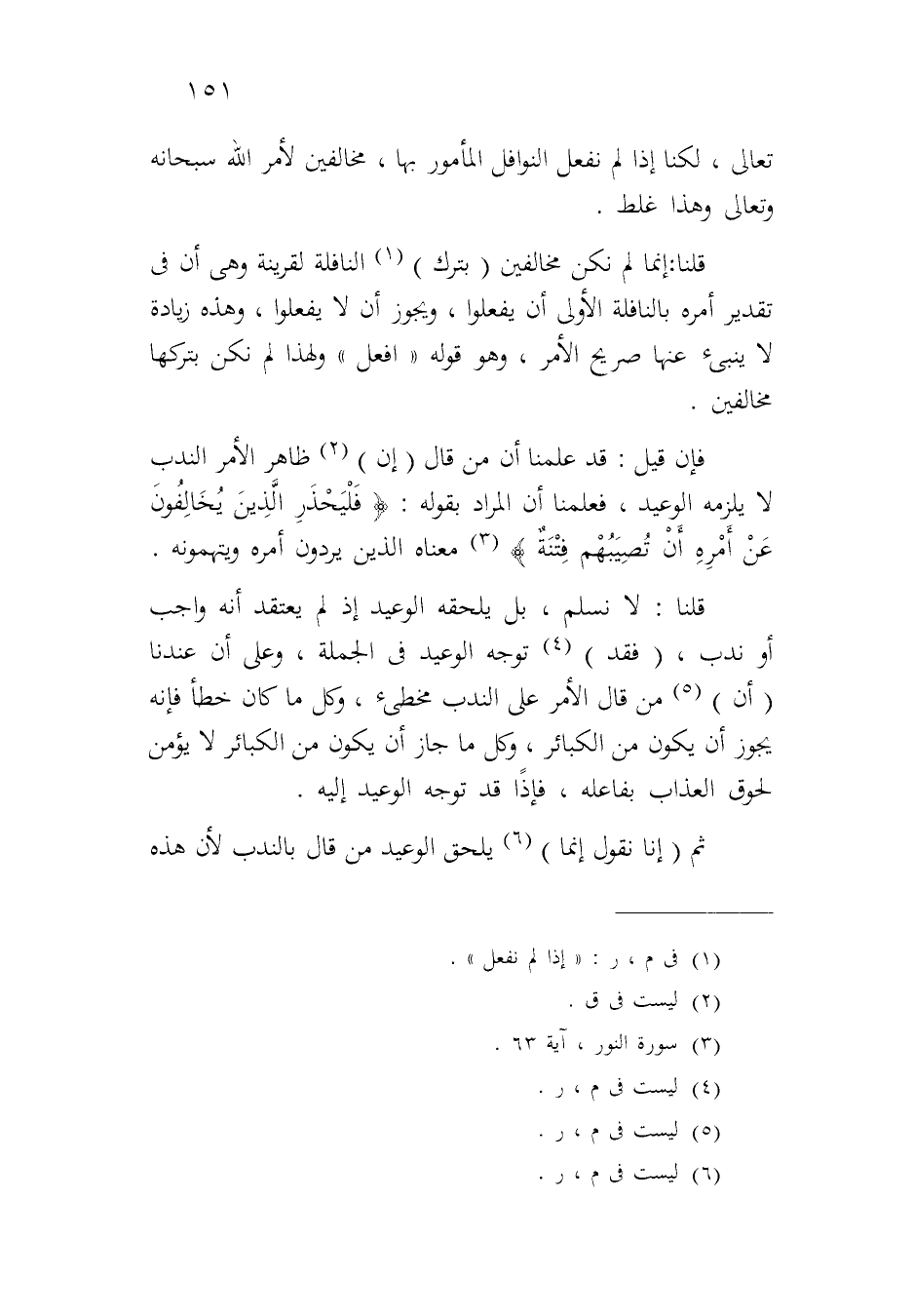 قلنا: لا نسلم، بل يلحقه الوعيد إذ لم يعتقد أنه واجب أو ندب، (فقد) توجه الوعيد في الجملة، وعلى أن عندنا (أن) من قال الأمر على الندب مخطئ، وكل ما كان خطأ فإنه يجوز أن يكون من الكبائر، وكل ما جاز أن يكون من الكبائر لا يؤمن لحوق العذاب بفاعله، فإذاً قد توجه الوعيد إليه.