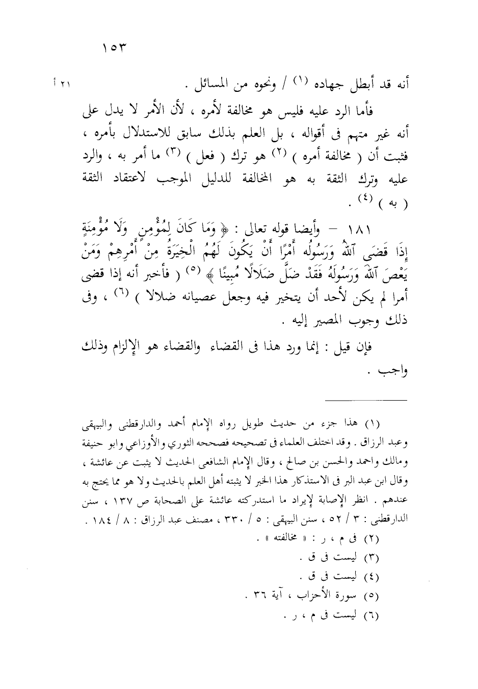 ١٨١ - وأيضاً قوله تعالى: {وَمَا كَانَ لِمُؤْمِنٍ وَلَا مُؤْمِنَةٍ إِذَا قَضَى اللَّهُ وَرَسُولُهُ أَمْرًا أَنْ يَكُونَ لَهُمُ الْخِيَرَةُ مِنْ أَمْرِهِمْ وَمَنْ يَعْصِ اللَّهَ وَرَسُولَهُ فَقَدْ ضَلَّ ضَلَالًا مُبِينًا} (فأخبر أنه إذا قضى أمراً لم يكن لأحد أن يتخير فيه وجعل عصيانه ضلالاً)، وفي ذلك وجوب المصير إليه.