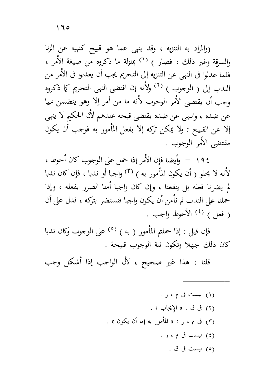 ١٩٤ - وأيضاً فإن الأمر إذا حمل على الوجوب كان أحوط، لأنه لا يخلو (أن يكون المأمور به) واجباً أو ندباً، فإن كان ندباً لم يضرنا فعله بل ينفعنا، وإن كان واجباً أمنا الضرر بفعله، وإذا حملنا على الندب لم نأمن أن يكون واجباً فنستضر بتركه، فدل على أن (فعل) الأحوط واجب.