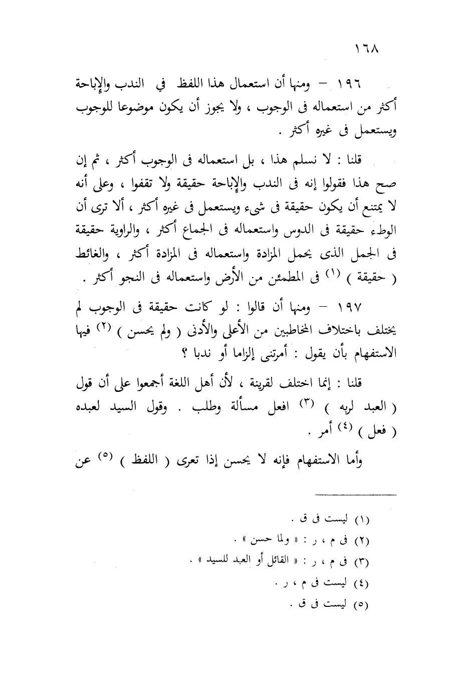 ١٩٦ - ومنها أن استعمال هذا اللفظ في الندب والإباحة أكثر من استعماله في الوجوب، ولا يجوز أن يكون موضوعاً للوجوب ويستعمل في غيره أكثر.