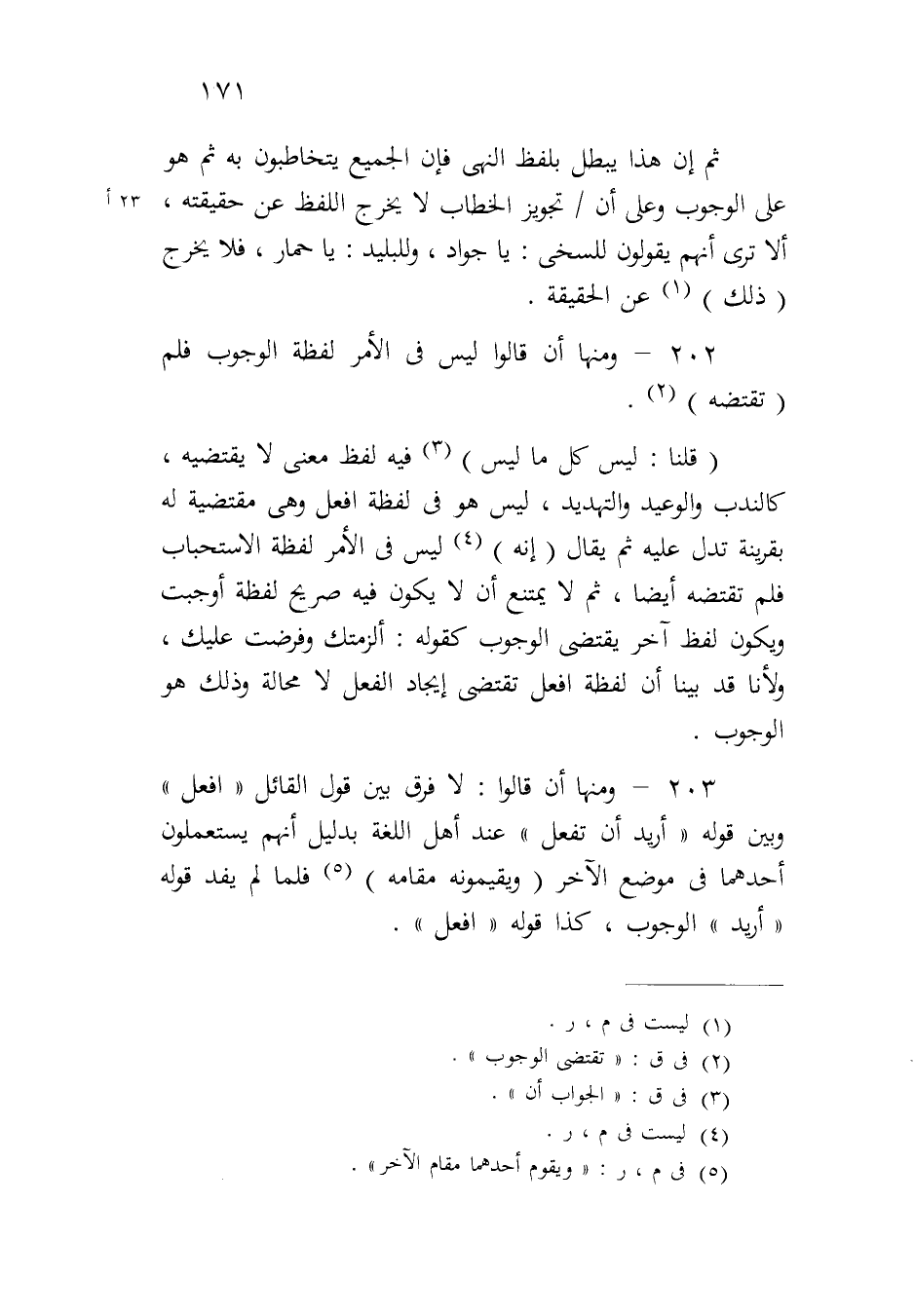 ٢٠٣ - ومنها أن قالوا: لا فرق بين قول القائل "افعل" وبين قوله "أريد أن تفعل" عند أهل اللغة بدليل أنهم يستعملون أحدهما في موضع الآخر (ويقيمونه مقامه) فلما لم يفد قوله "أريد" الوجوب، كذا قوله "افعل".