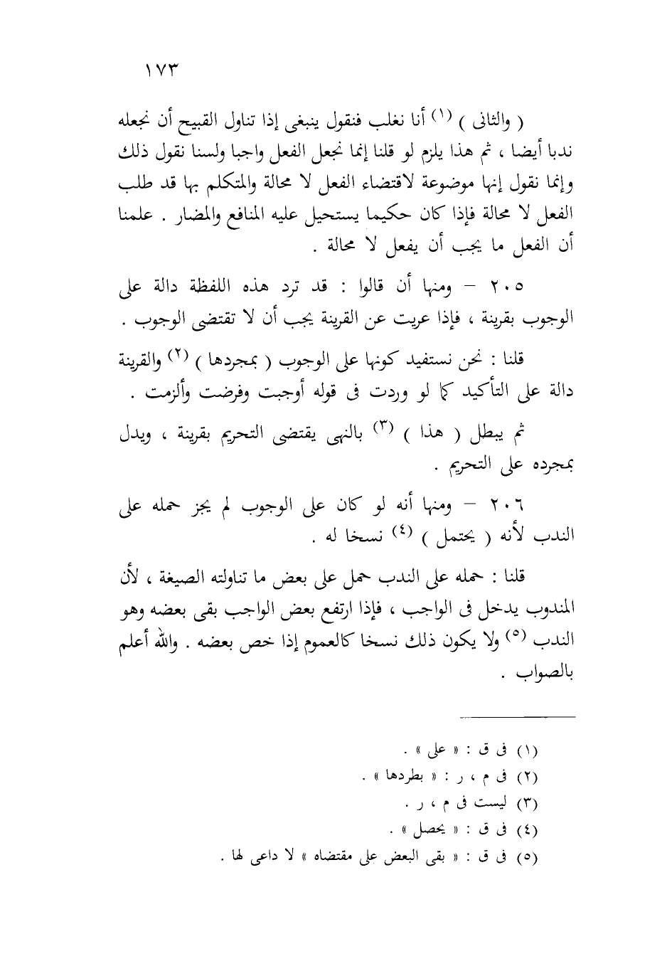 (والثاني) أنا نغلب فنقول ينبغي إذا تناول القبيح أن نجعله ندباً أيضاً، ثم هذا يلزم لو قلنا إنما نجعل الفعل واجباً ولسنا نقول ذلك وإنما نقول إنها موضوعة لاقتضاء الفعل لا محالة والمتكلم بها قد طلب الفعل لا محالة فإذا كان حكيماً يستحيل عليه المنافع والمضار. علمنا أن الفعل ما يجب أن يفعل لا محالة.