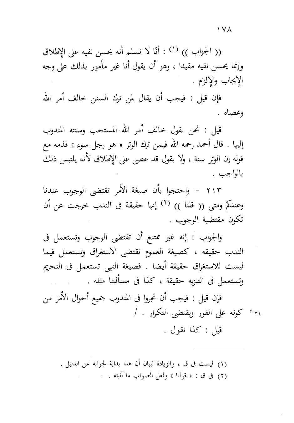 ٢١٣ - واحتجوا بأن صيغة الأمر تقتضي الوجوب عندنا وعندكم ومتى ((قلنا)) إنها حقيقة في الندب خرجت عن أن تكون مقتضية الوجوب.