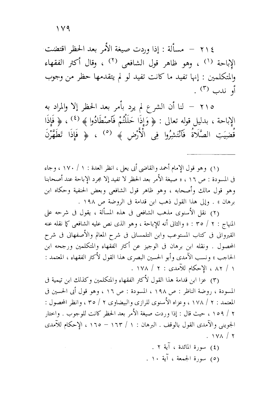 ٢١٥ - لنا أن الشرع لم يرد بأمر بعد الحظر إلا والمراد به الإباحة، بدليل قوله تعالى: {وَإِذَا حَلَلْتُمْ فَاصْطَادُوا}، {فَإِذَا قُضِيَتِ الصَّلَاةُ فَانْتَشِرُوا فِي الْأَرْضِ}، {فَإِذَا تَطَهَّرْنَ