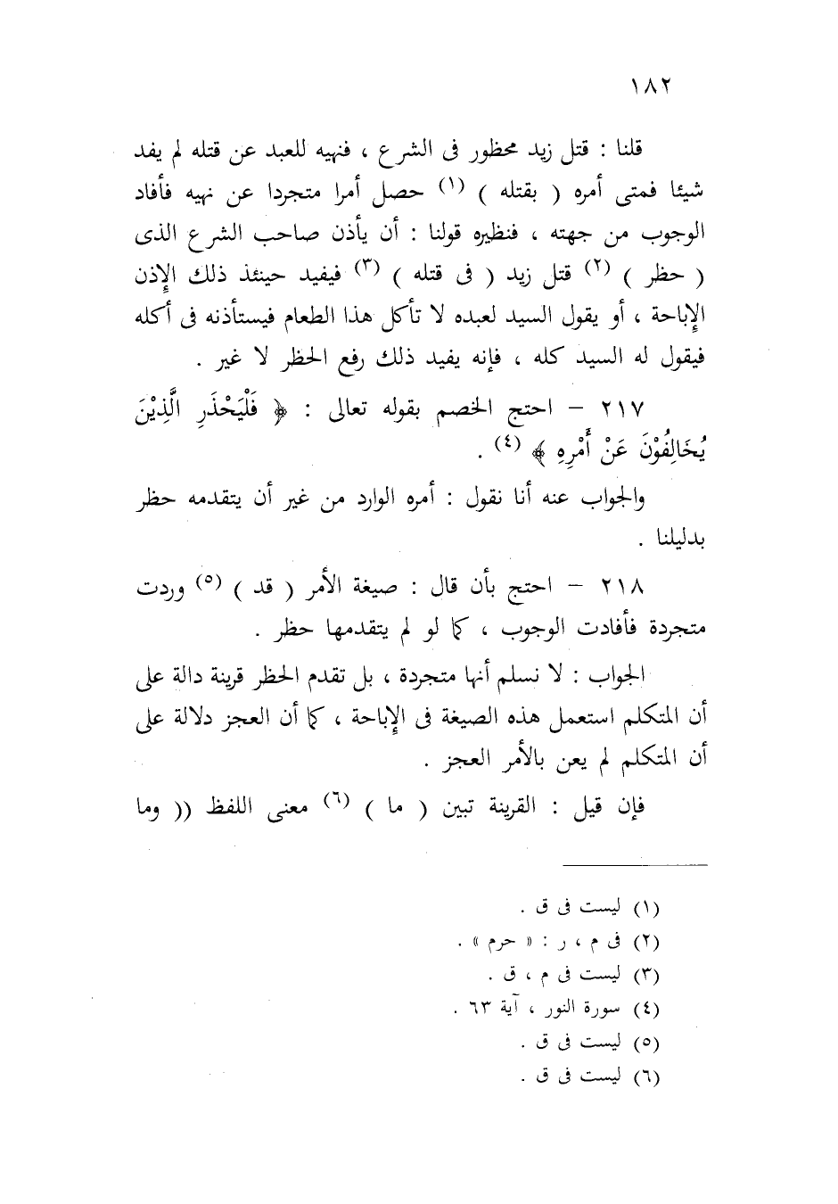 ٢١٧ - احتج الخصم بقوله تعالى: {فَلْيَحْذَرِ الَّذِينَ يُخَالِفُونَ عَنْ أَمْرِهِ}.