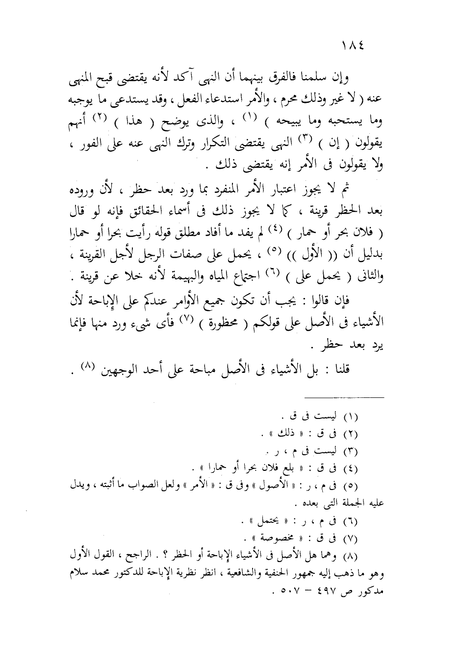 ثم لا يجوز اعتبار الأمر المنفرد بما ورد بعد حظر، لأن وروده بعد الحظر قرينة، كما لا يجوز ذلك في أسماء الحقائق فإنه لو قال (فلان بحر أو حمار) لم يفد ما أفاد مطلق قوله رأيت بحراً أو حماراً بدليل أن ((الأول))، يحمل على صفات الرجل لأجل القرينة، والثاني (يحمل على) اجتماع المياه والبهيمة لأنه خلا عن قرينة.