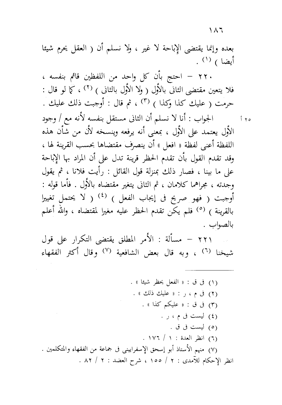 الجواب: أنا لا نسلم أن الثاني مستقل بنفسه لأنه مع ٢٥ أ/ وجود الأول يعتمد على الأول، بمعنى أنه يرفعه وينسخه لأن من شأن هذه اللفظة أعني لفظة "افعل" أن ينصرف مقتضاها بحسب القرينة لها، وقد تقدم القول بأن تقدم الحظر قرينة تدل على أن المراد بها الإباحة على ما بينا، فصار ذلك بمنزلة قول القائل: رأيت فلاناً، ثم يقول وجدته، مجراهما كلامان، ثم الثاني يتغير مقتضاه بالأول. فأما قوله: أوجبت (فهو صريح في إيجاب الفعل) (لا يحتمل تغييراً بالقرينة) فلم يكن تقدم الحظر عليه مغيراً لمقتضاه، والله أعلم بالصواب.