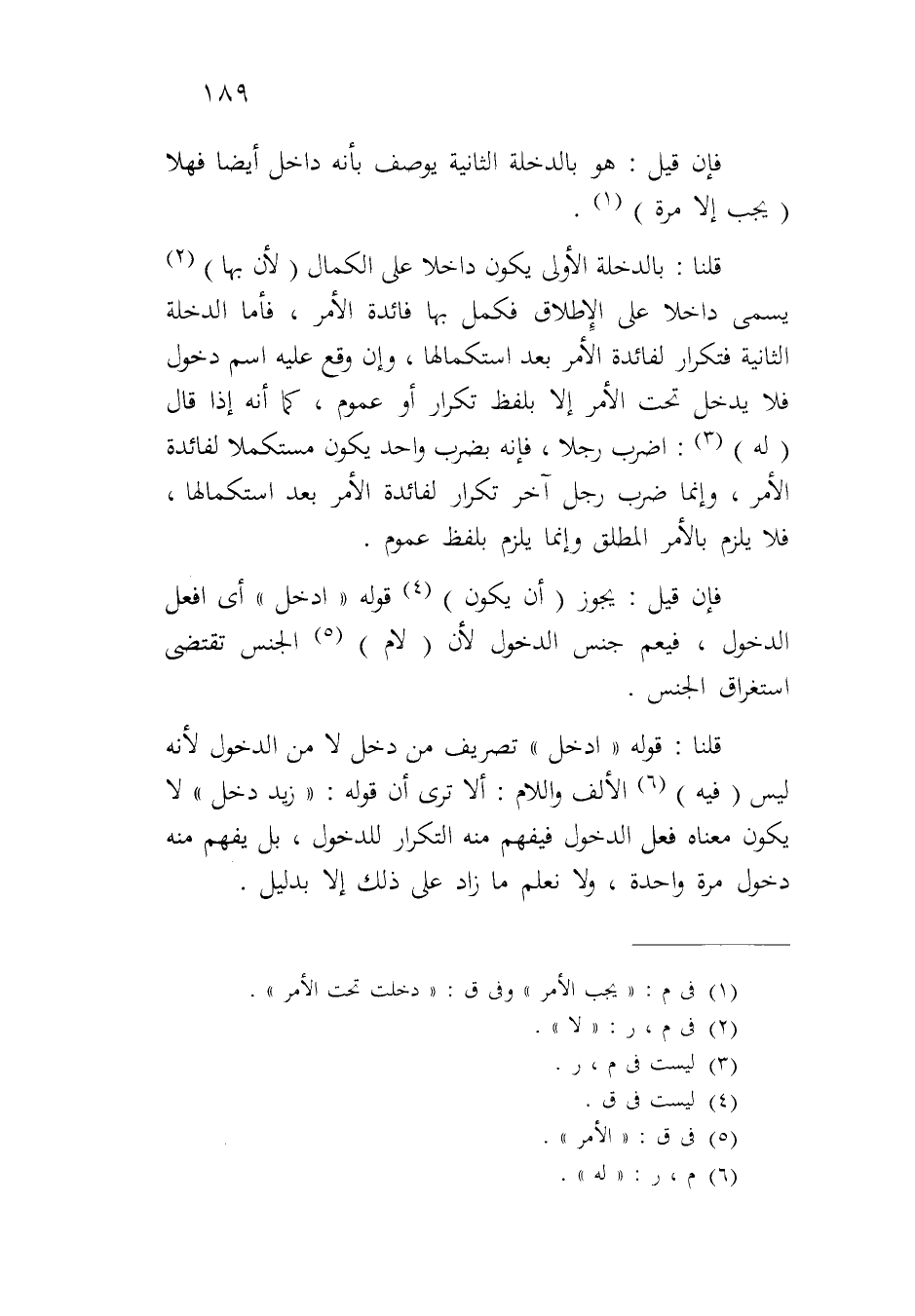 قلنا: بالدخلة الأولى يكون داخلاً على الكمال (لأن بها) يسمى داخلاً على الإطلاق فكمل بها فائدة الأمر، فأما الدخلة الثانية فتكرار لفائدة الأمر بعد استكمالها، وإن وقع عليه اسم دخول فلا يدخل تحت الأمر إلا بلفظ تكرار أو عموم، كما أنه إذا قال (له): اضرب رجلاً، فإنه بضرب واحد يكون مستكملاً لفائدة الأمر، وإنما ضرب رجل آخر تكرار لفائدة الأمر بعد استكمالها، فلا يلزم بالأمر المطلق وإنما يلزم بلفظ عموم.
