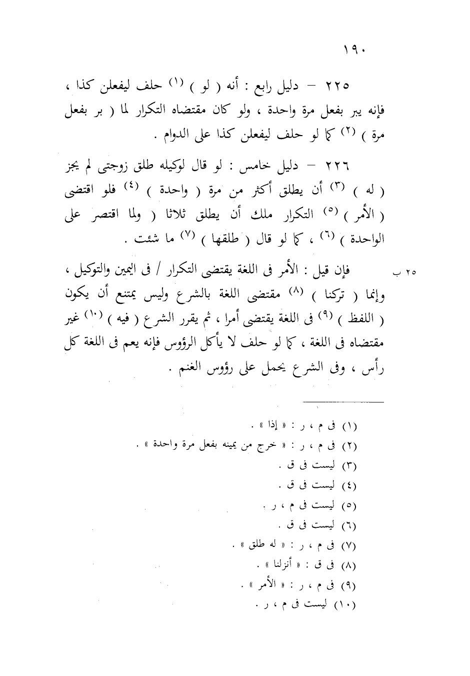 ٢٢٦ - دليل خامس: لو قال لوكيله طلق زوجتي لم يجز (له) أن يطلق أكثر من مرة (واحدة) فلو اقتضى (الأمر) التكرار ملك أن يطلق ثلاثاً (ولما اقتصر على الواحدة)، كما لو قال (طلقها) ما شئت.
