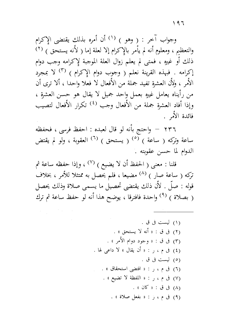 ٢٣٦ - واحتج بأنه لو قال لعبده: احفظ فرسي، فحفظه ساعة وتركه (ساعة) (يستحق) العقوبة، ولو لم يقتض الدوام لما حسن عقوبته.