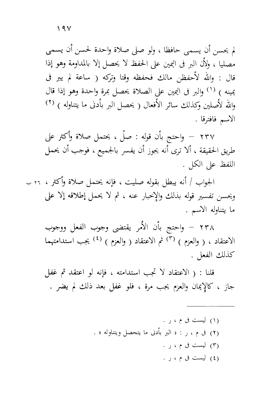 ٢٣٨ - واحتج بأن الأمر يقتضي وجوب الفعل ووجوب الاعتقاد، (والعزم) ثم الاعتقاد (والعزم) يجب استدامتها كذلك الفعل.