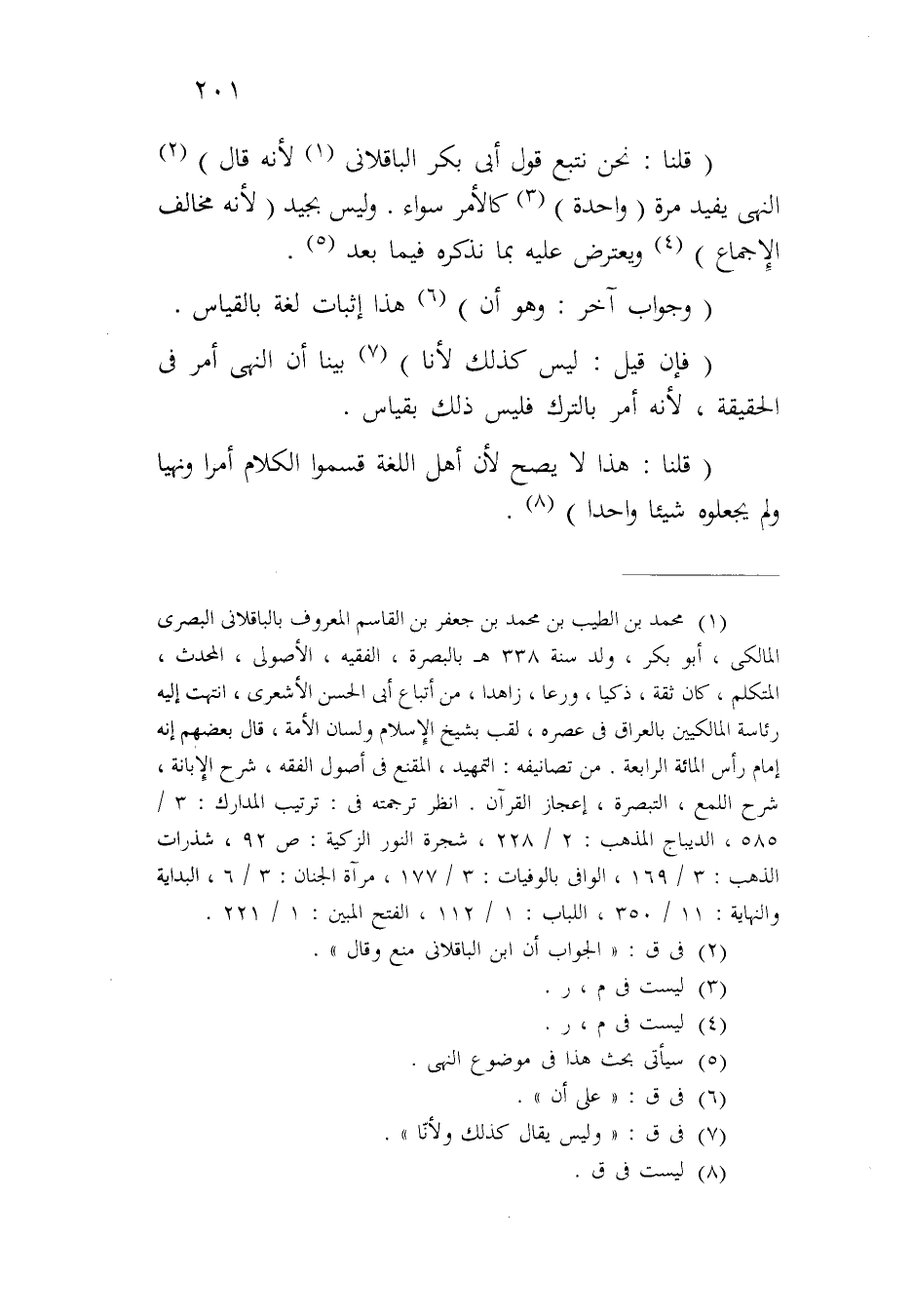 (قلنا: نحن نتبع قول أبي بكر الباقلاني لأنه قال) النهي يفيد مرة (واحدة) كالأمر سواء. وليس بجيد (لأنه مخالف الإجماع) ويعترض عليه بما نذكره فيما بعد.
