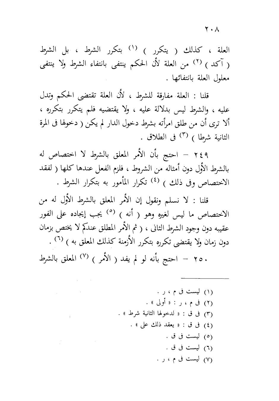 ٢٤٩ - احتج بأن الأمر المعلق بالشرط لا اختصاص له بالشرط الأول دون أمثاله من الشروط، فلزم الفعل عندها كلها (لفقد الاختصاص وفي ذلك) تكرار المأمور به بتكرار الشرط.