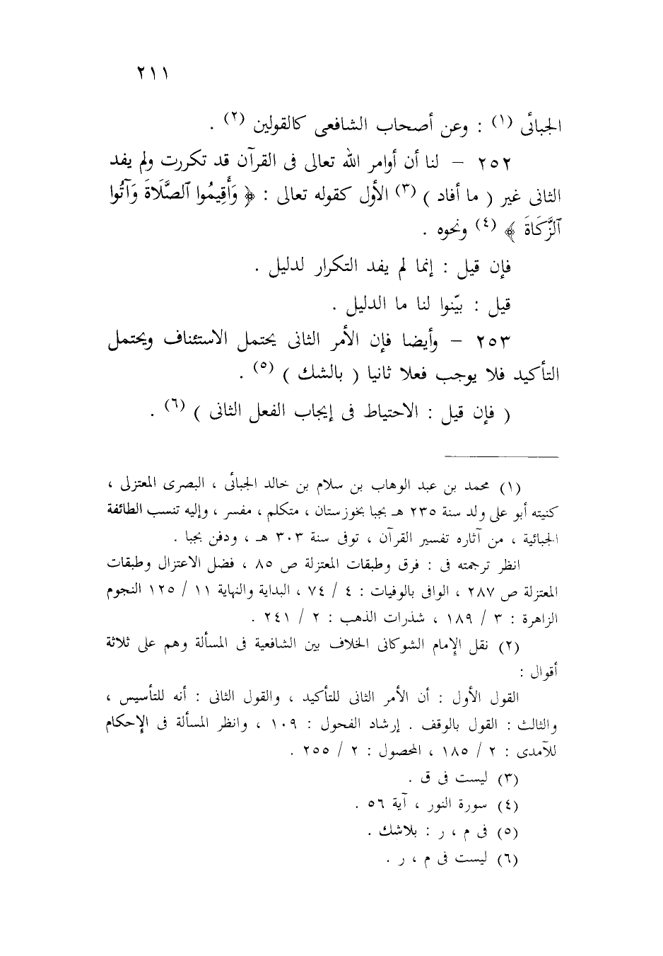 ٢٥٢ - لنا أن أوامر الله تعالى في القرآن قد تكررت ولم يفد الثاني غير (ما أفاد) الأول كقوله تعالى: {وَأَقِيمُوا الصَّلاةَ وَآتُوا الزَّكَاةَ} ونحوه.