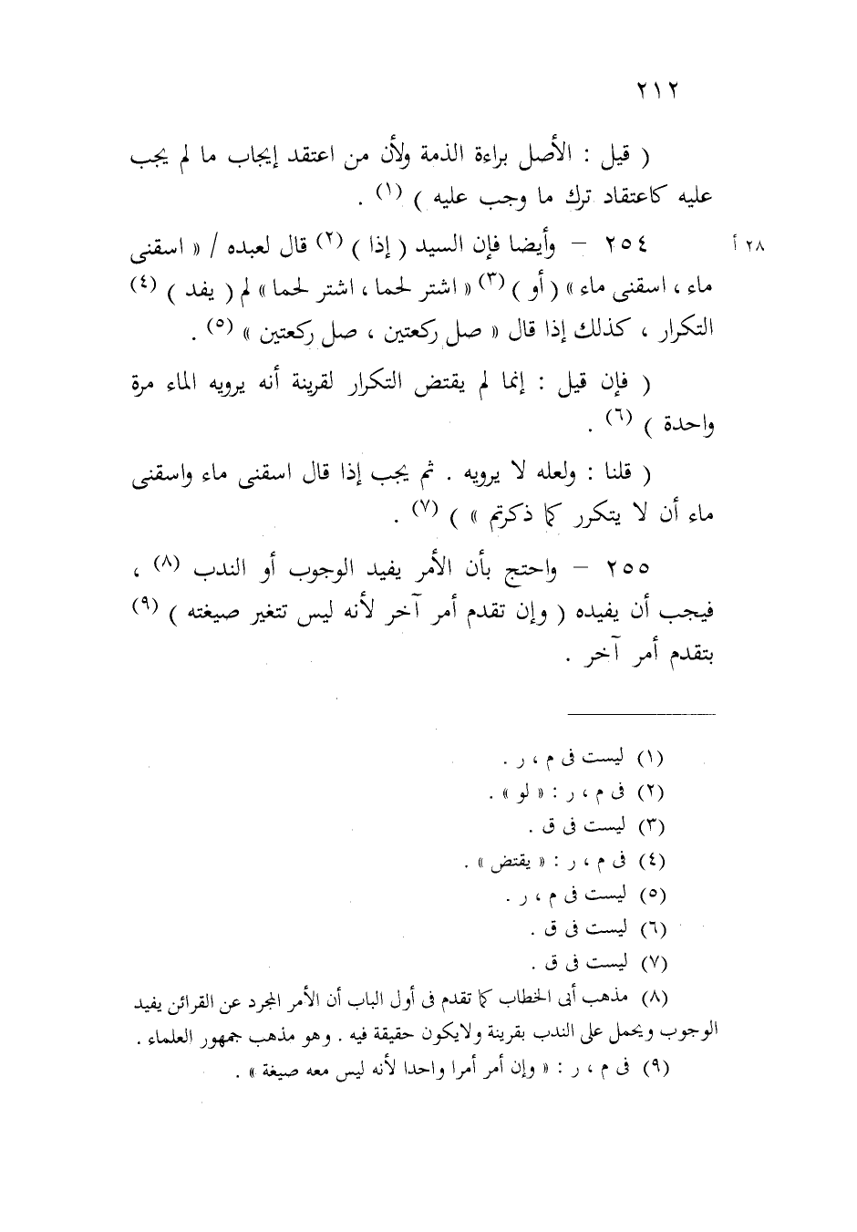 ٢٥٤ - وأيضاً فإن السيد (إذا) قال لعبده/٢٨ أ "اسقني ماء، اسقني ماء" (أو) "اشتر لحماً، اشتر لحماً" لم (يفد) التكرار، كذلك إذا قال "صل ركعتين، صل ركعتين".