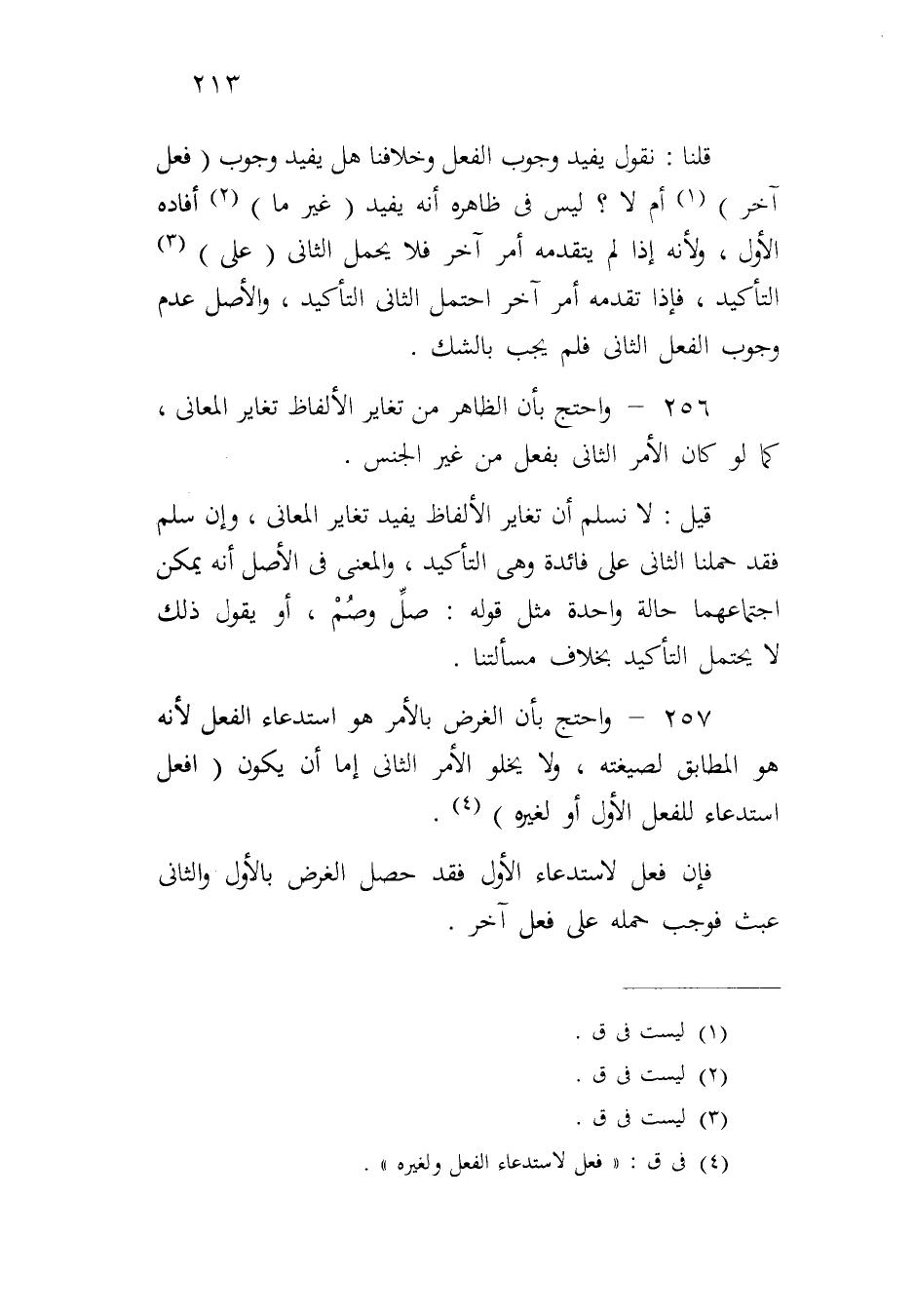 ٢٥٧ - واحتج بأن الغرض بالأمر هو استدعاء الفعل لأنه هو المطابق لصيغته، ولا يخلو الأمر الثاني إما أن يكون (افعل) استدعاء للفعل الأول أو لغيره).