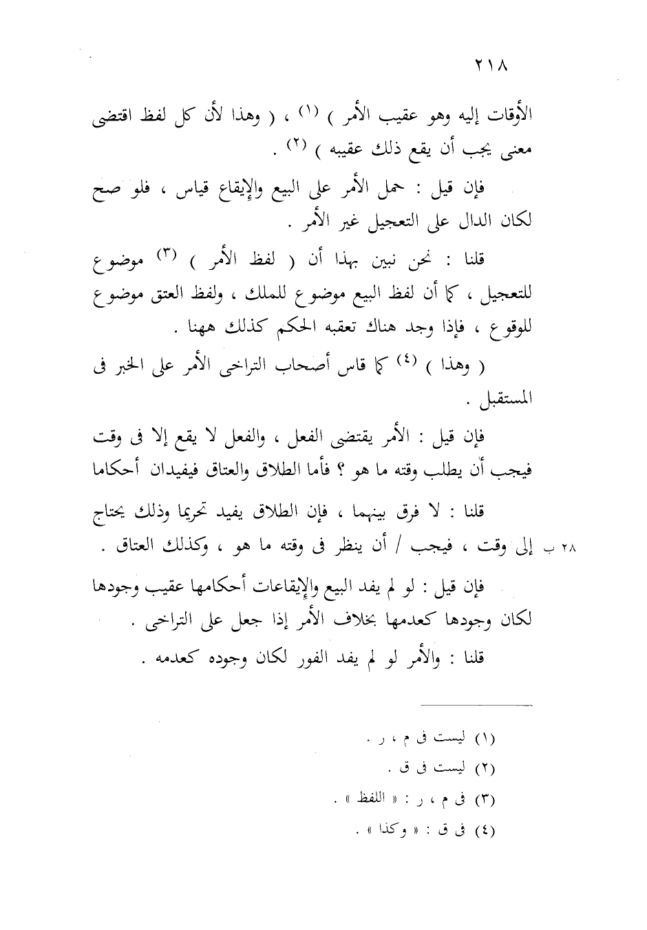 الأوقات إليه وهو عقيب الأمر)، (وهذا لأن كل لفظ اقتضى معنى يجب أن يقع ذلك عقيبه).