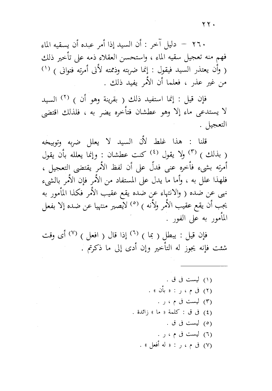 ٢٦٠ - دليل آخر: أن السيد إذا أمر عبده أن يسقيه الماء فهم منه تعجيل سقيه الماء، واستحسن العقلاء ذمه على تأخير ذلك (وأن يعتذر السيد فيقول: إنما ضربته وذممته لأني أمرته فتوانى) من غير عذر، فعلما أن الأمر يفيد ذلك.