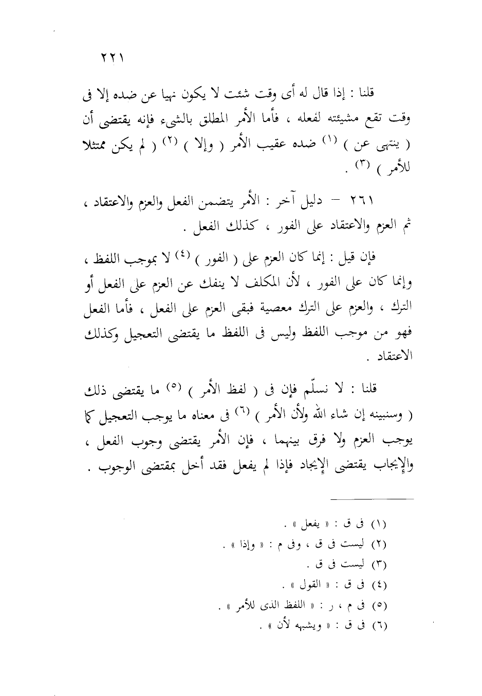 ٢٦١ - دليل آخر: الأمر يتضمن الفعل والعزم والاعتقاد، ثم العزم والاعتقاد على الفور، كذلك الفعل.