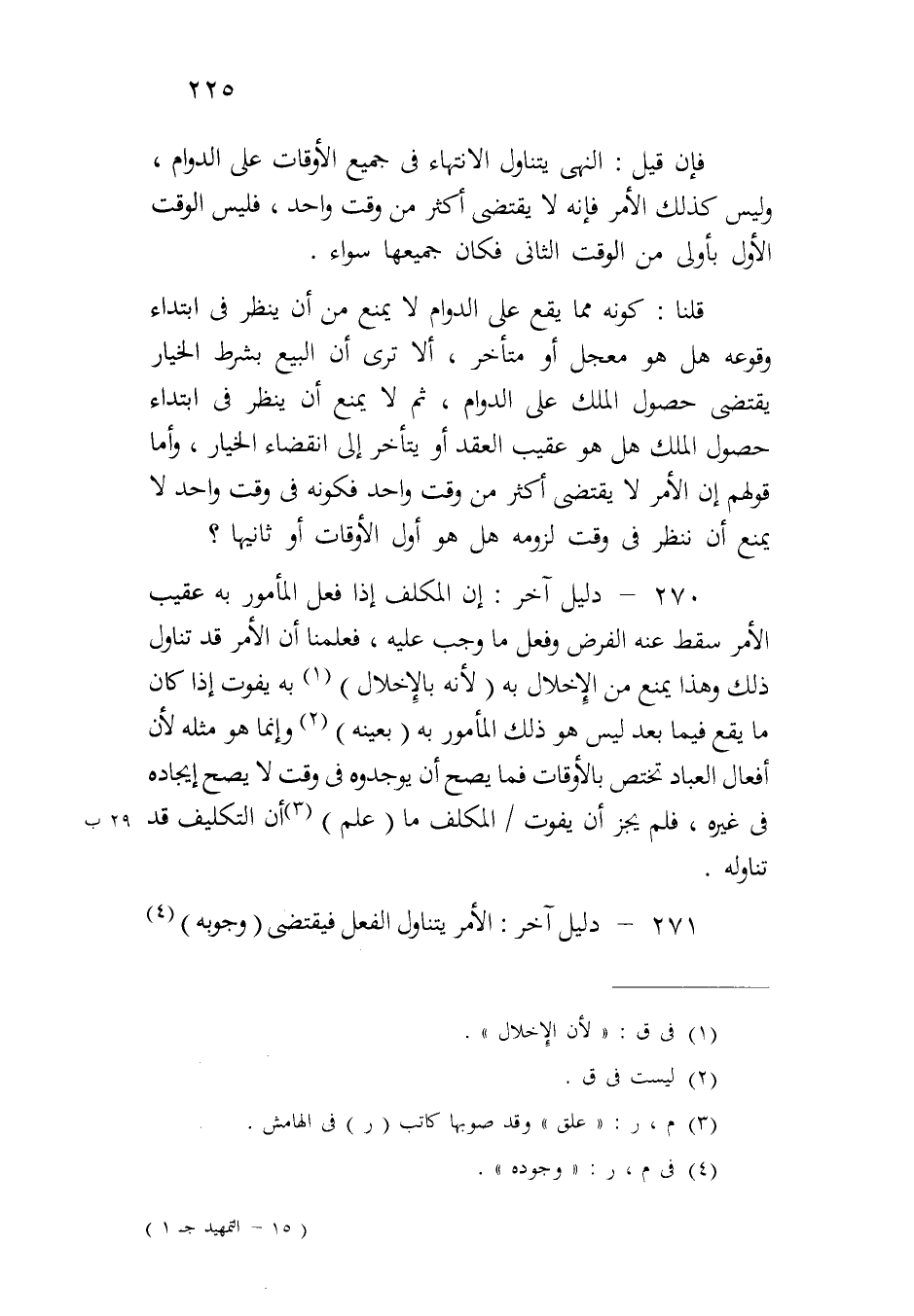 ٢٧٠ - دليل آخر: إن المكلف إذا فعل المأمور به عقيب الأمر سقط عنه الفرض وفعل ما وجب عليه، فعلمنا أن الأمر قد تناول ذلك وهذا يمنع من الإخلال به (لأنه بالإخلال) به يفوت إذا كان ما يقع فيما بعد ليس هو ذلك المأمور به (بعينه) وإنما هو مثله لأن أفعال العباد تختص بالأوقات فما يصح أن يوجدوه في وقت لا يصح إيجاده في غيره، فلم يجز أن يفوت/٢٩ ب المكلف ما (علم) أن التكليف قد تناوله.
