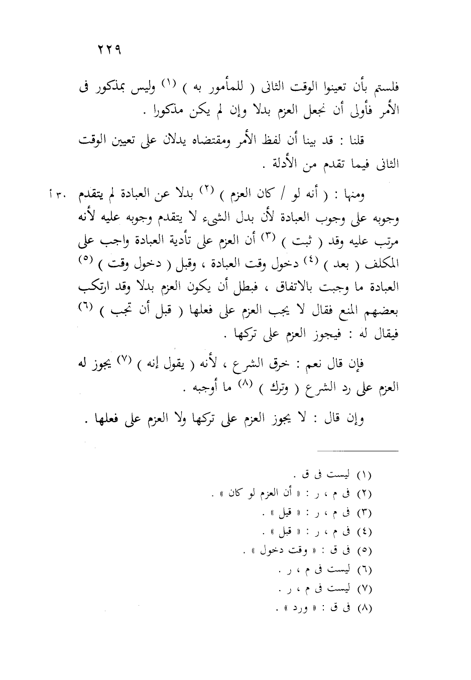ومنها: (أنه لو/٣٠ أكان العزم) بدلاً عن العبادة لم يتقدم وجوبه على وجوب العبادة لأن بدل الشيء لا يتقدم وجوبه عليه لأنه مرتب عليه وقد (ثبت) أن العزم على تأدية العبادة واجب على المكلف (بعد) دخول وقت العبادة، وقبل (دخول وقت) العبادة ما وجبت بالاتفاق، فبطل أن يكون العزم بدلاً وقد ارتكب بعضهم المنع فقال لا يجب العزم على فعلها (قبل أن تجب) فيقال له: فيجوز العزم على تركها.