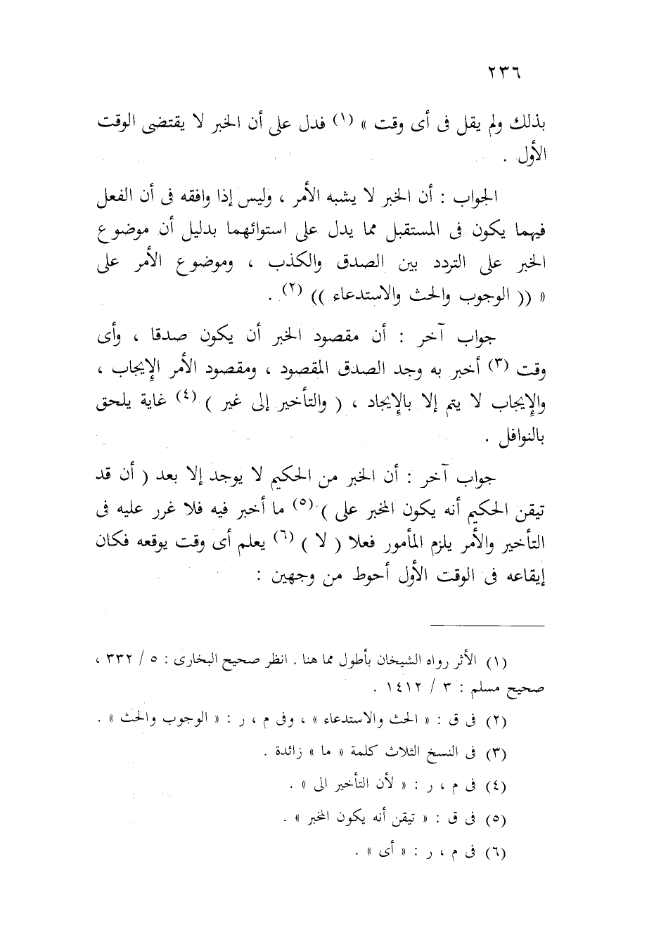 جواب آخر: أن الخبر من الحكيم لا يوجد إلا بعد (أن قد تيقن الحكيم أنه يكون المخبر على) ما أخبر فيه فلا غرر عليه في التأخير والأمر يلزم المأمور فعلا (لا) يعلم أي وقت يوقعه فكان إيقاعه في الوقت الأول أحوط من وجهين: