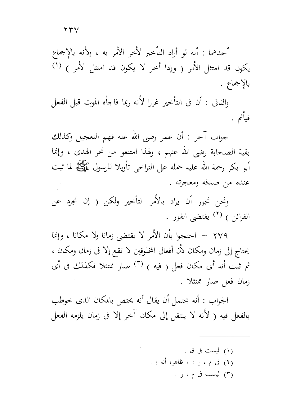 ٢٧٩ - احتجوا بأن الأمر لا يقتضي زماناً ولا مكانا، وإنما يحتاج إلى زمان ومكان لأن أفعال المخلوقين لا تقع إلا في زمان ومكان، ثم ثبت أنه أي مكان فعل (فيه) صار ممتثلاً فكذلك في أي زمان فعل صار ممتثلاً.