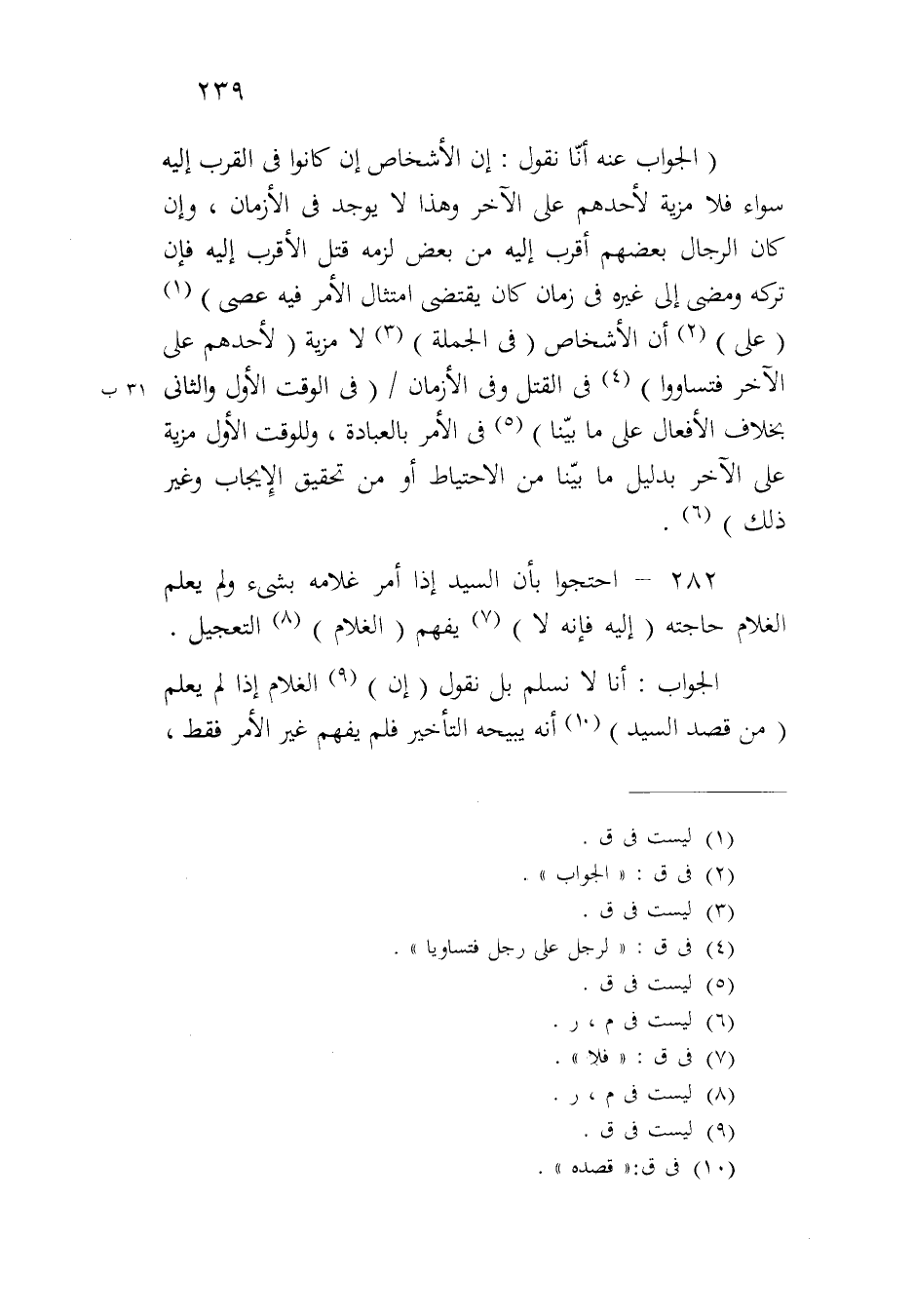 (الجواب عنه أنا نقول: إن الأشخاص إن كانوا في القرب إليه سواء فلا مزية لأحدهم على الآخر وهذا لا يوجد في الأزمان، وإن كان الرجال بعضهم أقرب إليه من بعض لزمه قتل الأقرب إليه فإن تركه ومضى إلى غيره في زمان كان يقتضي امتثال الأمر فيه عصى) (على) أن الأشخاص (في الجملة) لا مزية (لأحدهم على الآخر فتساووا) في القتل وفي الأزمان/٣١ ب (في الوقت الأول والثاني بخلاف الأفعال على ما بينا) في الأمر بالعبادة، وللوقت الأول مزية على الآخر بدليل ما بينا من الاحتياط أو من تحقيق الإيجاب وغير ذلك).