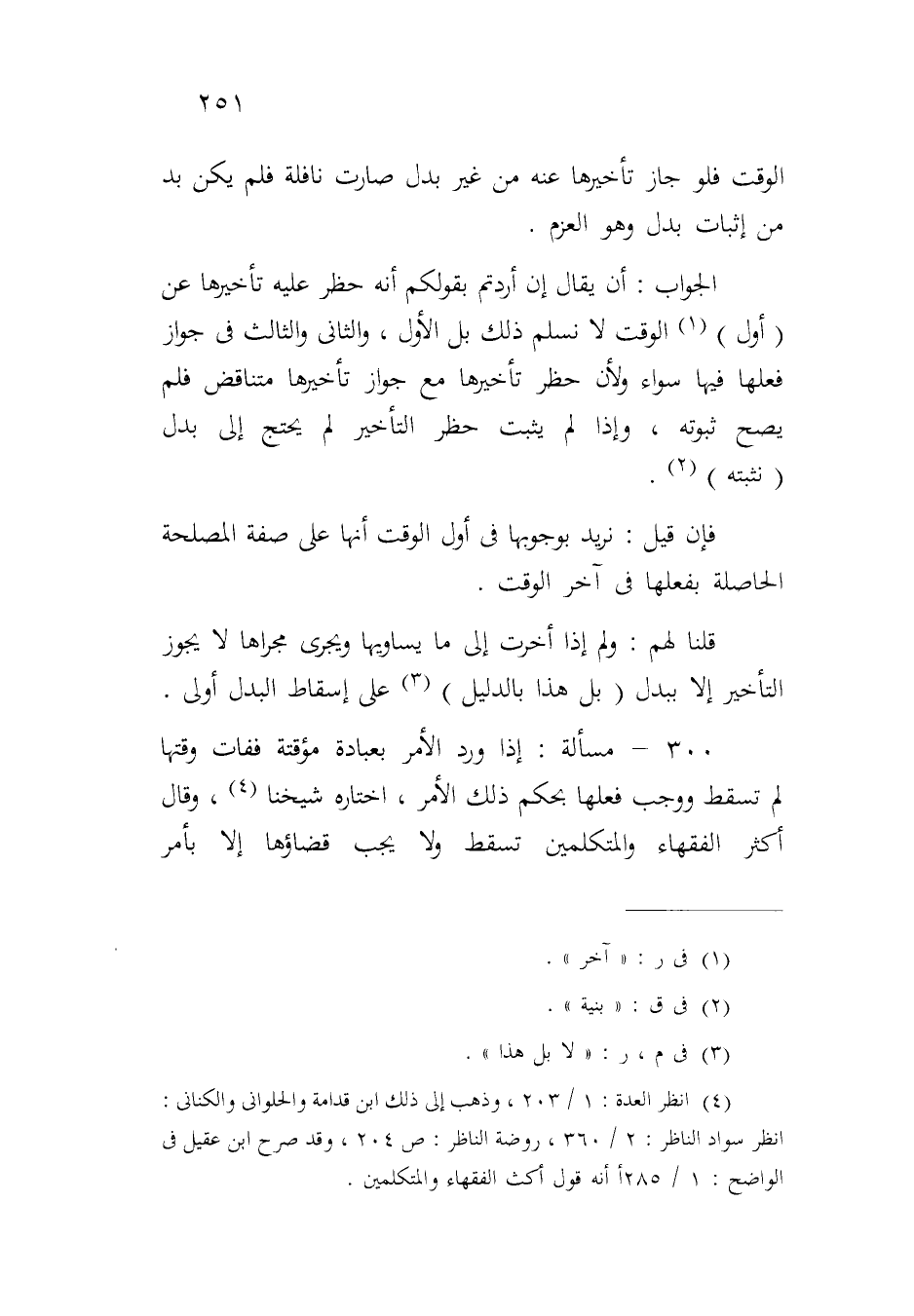 ٣٠٠ - مسألة: إذا ورد الأمر بعبادة مؤقتة ففات وقتها لم تسقط ووجب فعلها بحكم ذلك الأمر، اختاره شيخنا، وقال أكثر الفقهاء والمتكلمين تسقط ولا يجب قضاؤها إلا بأمر