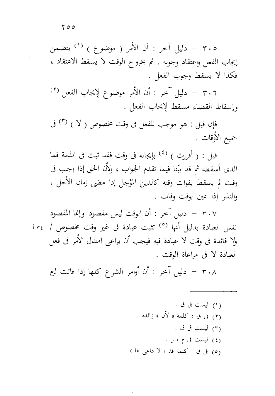 ٣٠٥ - دليل آخر: أن الأمر (موضوع) يتضمن إيجاب الفعل واعتقاد وجوبه. ثم بخروج الوقت لا يسقط الاعتقاد، فكان لا يسقط وجوب الفعل.
