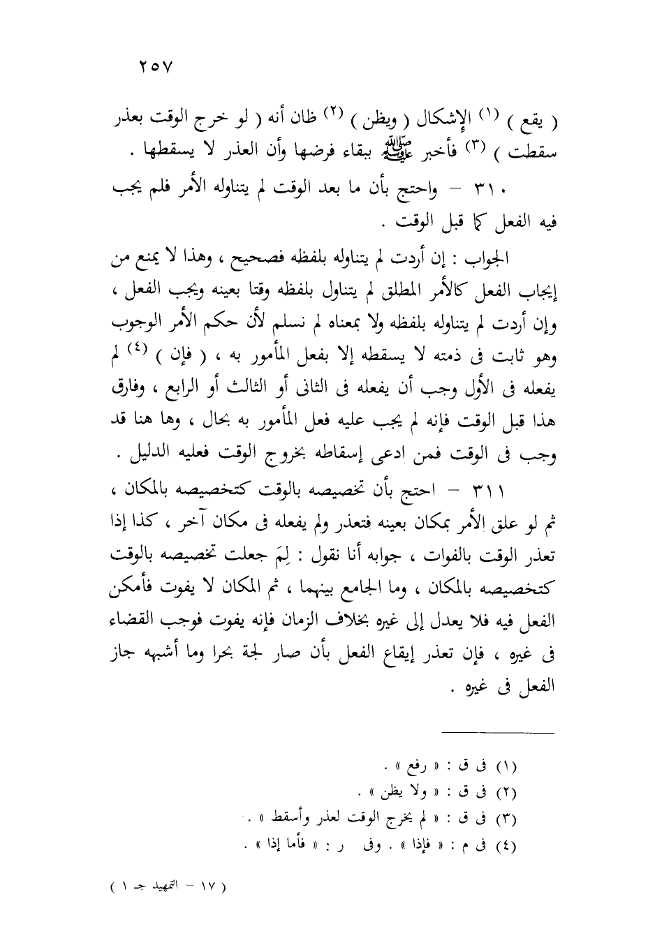 ٣١٠ - واحتج بأن ما بعد الوقت لم يتناوله الأمر فلم يجب فيه الفعل كما قبل الوقت.