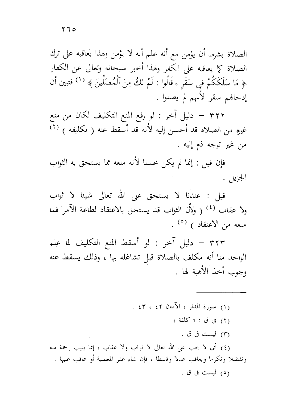 ٣٢٣ - دليل آخر: لو أسقط المنع التكليف لما علم الواحد منا أنه مكلف بالصلاة قبل تشاغله بها، وذلك يسقط عنه وجوب أخذ الأهبة لها.
